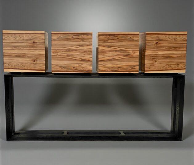Intention et identité La console « Octogenti » met en scène un plateau en Buginga pommelé dont la teinte rouge cuivrée et les reflets profonds constituent l’axe esthétique du projet. L’intention : sublimer la matière par une géométrie épurée et des proportions équilibrées, afin que l’œil perçoive d’abord la qualité du bois et la précision de sa ...