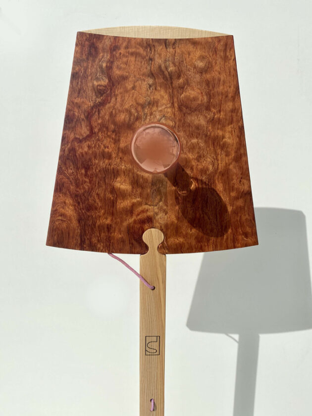 « Ombre » réinterprète le lampadaire classique en lui donnant une présence graphique singulière. De face, l’abat-jour évoque l’icône 2D de l’objet ; en volume, le bois révèle ses reflets cuivrés et sa profondeur. La lumière souligne ce double registre : ample, lisible, confortable, jamais agressive. Le parti pris de design intègre le câblage comme […]