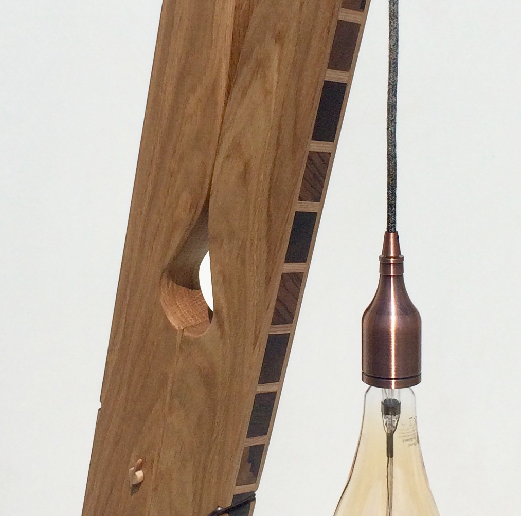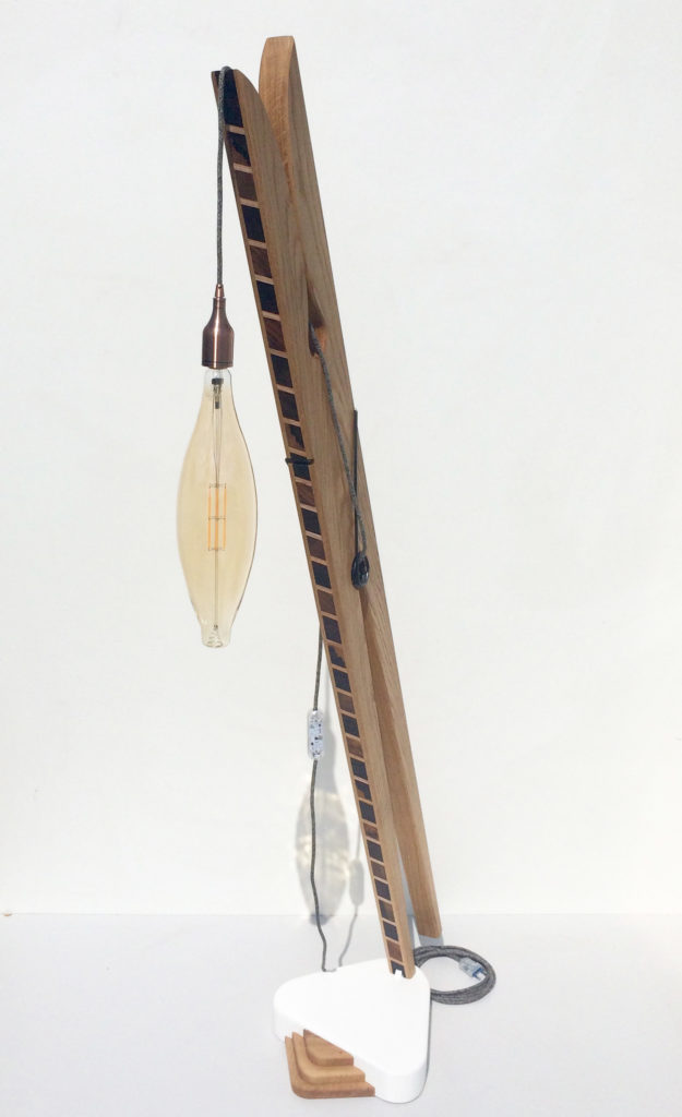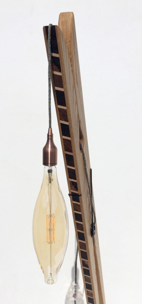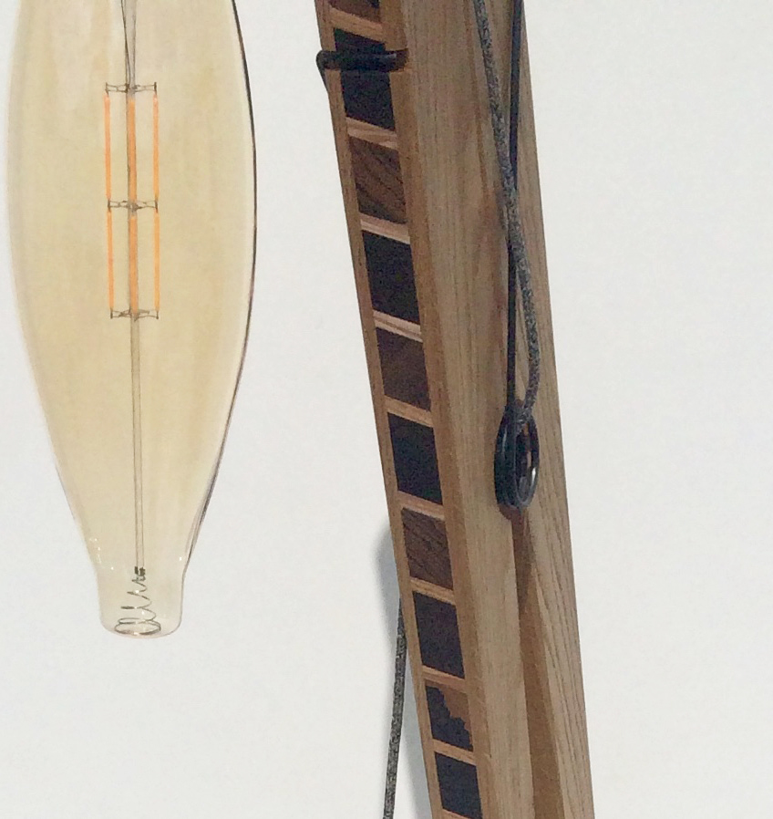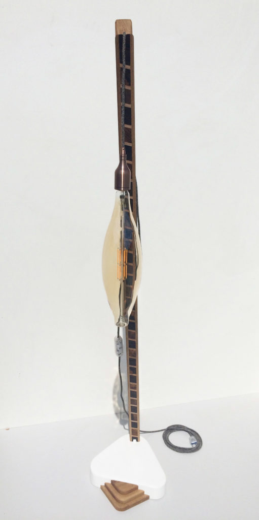 La base est constituée d’un assemblage de bois, métal, béton et résine. J’ai réalisée une longue rainure dans une des branches (avec les pieces de bois exotiques). Cela permet à ce lampadaire design de s’enfiler comme une chaussette dans une tige en acier de plus de 60 cm. Cette astuce technique permet de donner une impression d’équilibre à l’ensemble.
