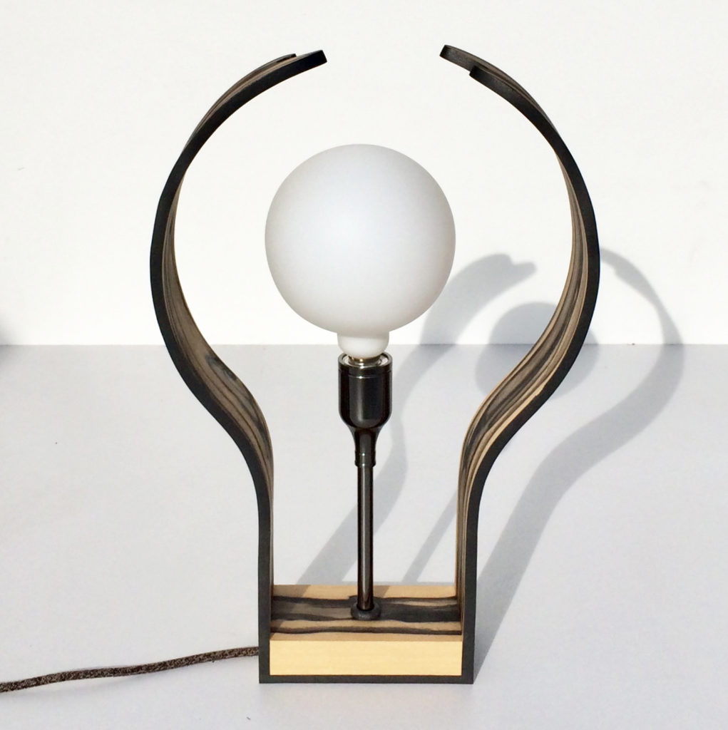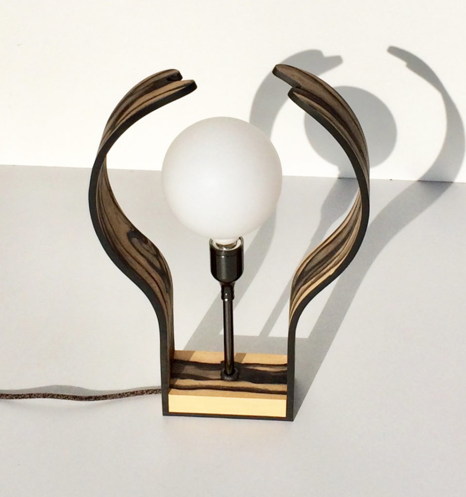 C’est en regardant la lampe « ampoule » sous un angle différent que j’ai eu l’idée de réaliser cette lampe. Nous connaissons tous ces images de mains qui tiennent une lumière symbolisant le soleil entre leurs mains. J’aime beaucoup cette vision symbolique de l’énergie lumineuse, source de vie. Les deux parties opposées autour de la lampe cherchent à donner cette impression. Cependant, au premier coup d’oeil il est évident qu’il ne s’agit pas de mains, mais simplement de formes symbolisant deux mains.