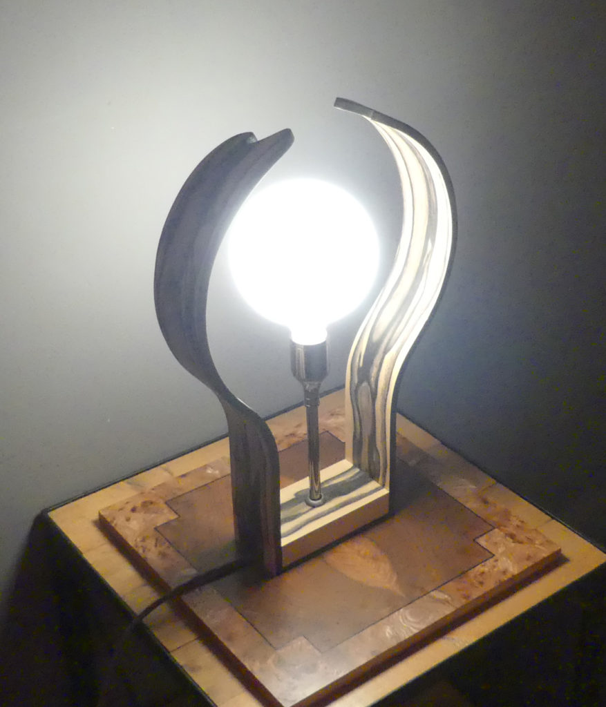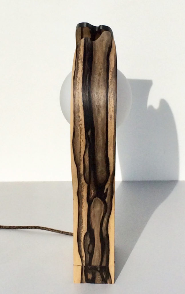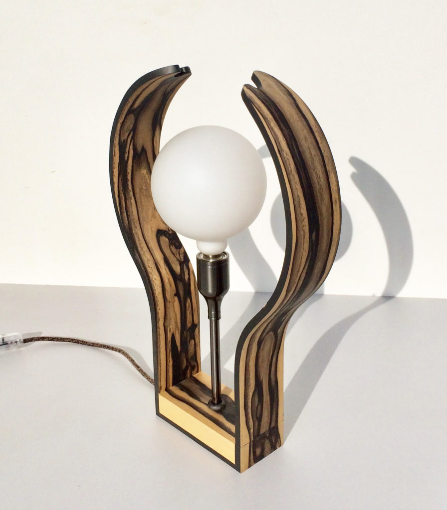 L’essence de bois qui compose cette lampe design est originaire d’Afrique Centrale et est particulièrement rare, l’Ebène Blanc. Ce bois me fascine toujours autant, à la fois de part ces contrastes intenses de couleurs ainsi que part ces lignes anthracites traçant leurs chemins sur cette terre si claire.
