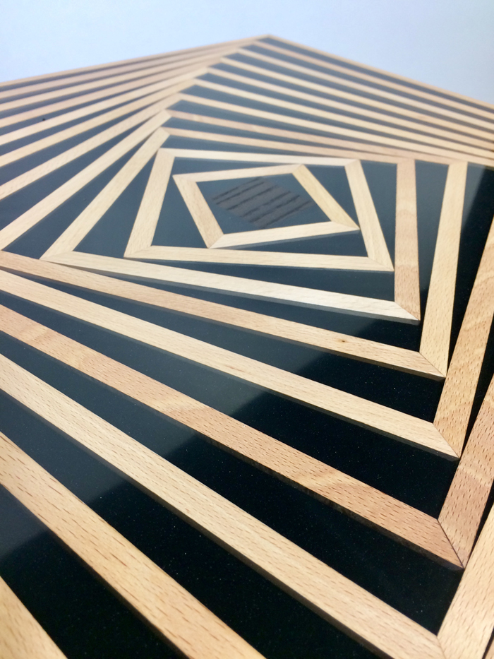 Le plateau est relativement simple. Toute l’originalité du plateau réside dans l’assemblage et la disposition de ces cadres en bois de Hêtre. Ainsi disposés, on ne voit plus de simples cadres carrés mais une étoile à 4 branches. Le fond noir ou blanc change aussi grandement l’impression dégagée. Le tout est liée avec de la résine epoxy transparente permettant de voir les cadres en partie.