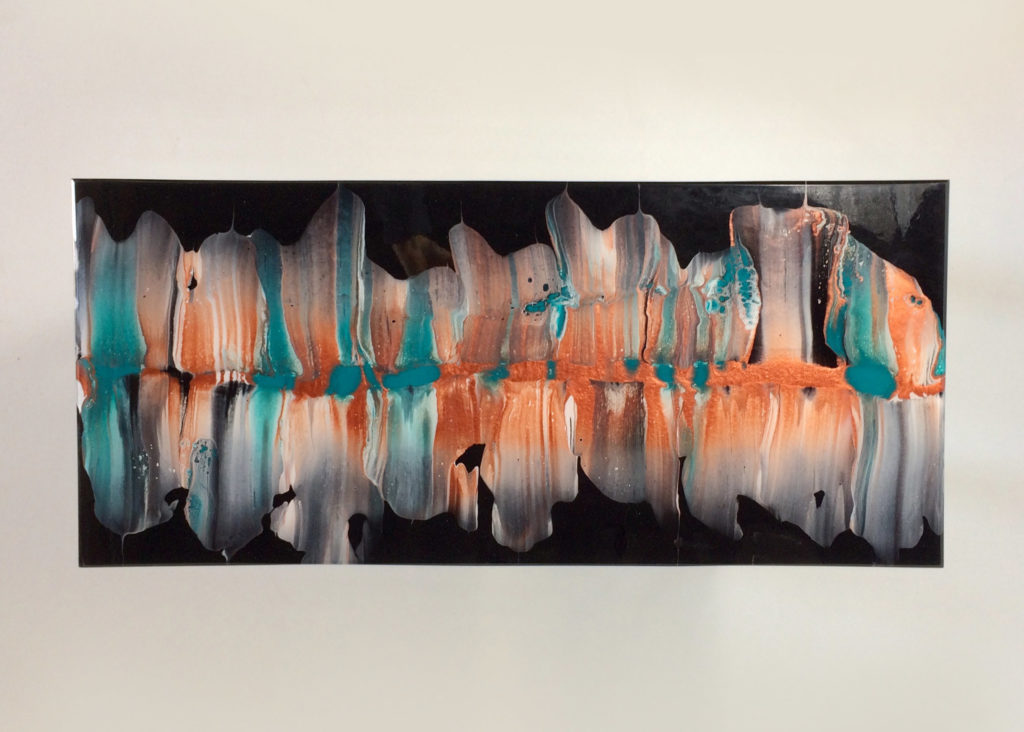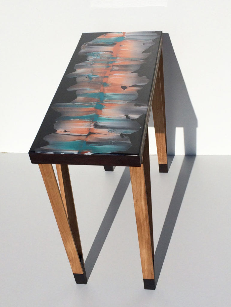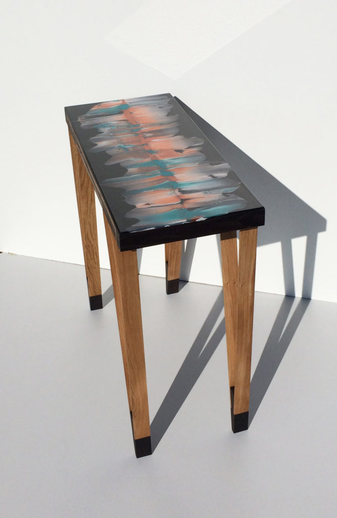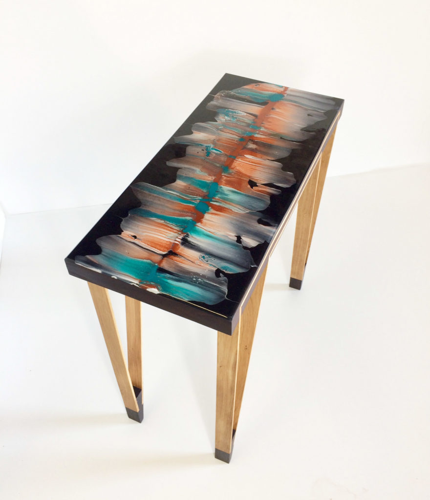 Pari réussi ? Pour le piétement je pense que oui. Concernant le plateau de table, cette question étant éminemment subjective, je ne peux y répondre… Pourtant, je me suis vraiment bien amusé à le réaliser. Sur ce plateau de table, j’ai réalisé une peinture abstraite avec de la peinture acrylique. Cette peinture étant ensuite recouverte de de résine transparente, lui donnant une brillance et une profondeur remarquable. J’ai appelé cette console design « rouille » car l’idée de cette peinture est inspirée de l’oxydation du cuivre qui prend parfois de magnifiques teintes bleutées.