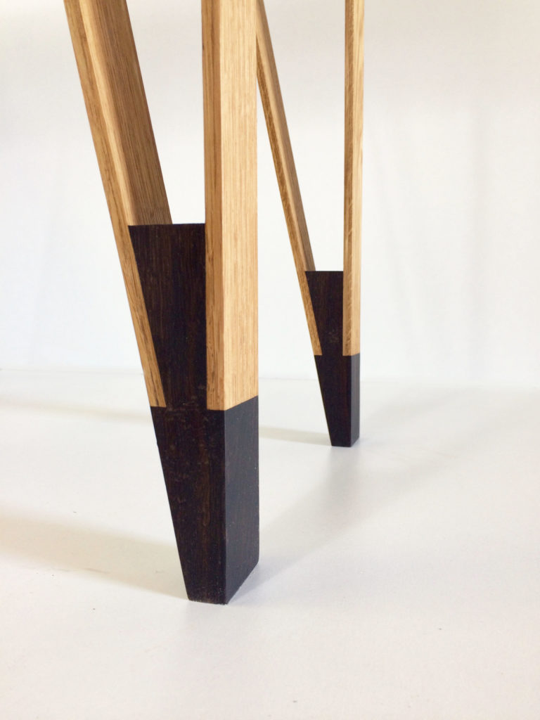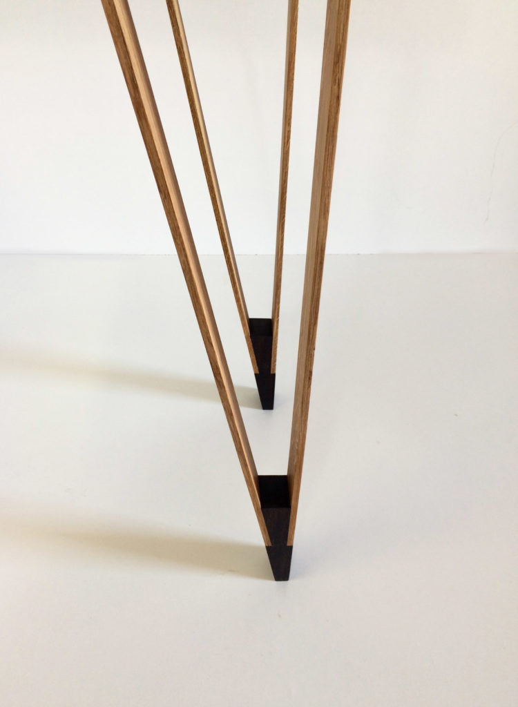 J’ai voulu pour le piétement donner à la fois une impression de légèreté mais aussi de robustesse en l’intégrant complètement dans le plateau de la console. La légèreté est obtenue par l’assemblage de fines lames de chêne, jointe par un « sabot » en noyer massif. La robustesse, se voit à l’oeil nu, et l’on comprend immédiatement que les pieds sont « noyés » dans le plateau de la table, rendant cet assemblage stable et solide.