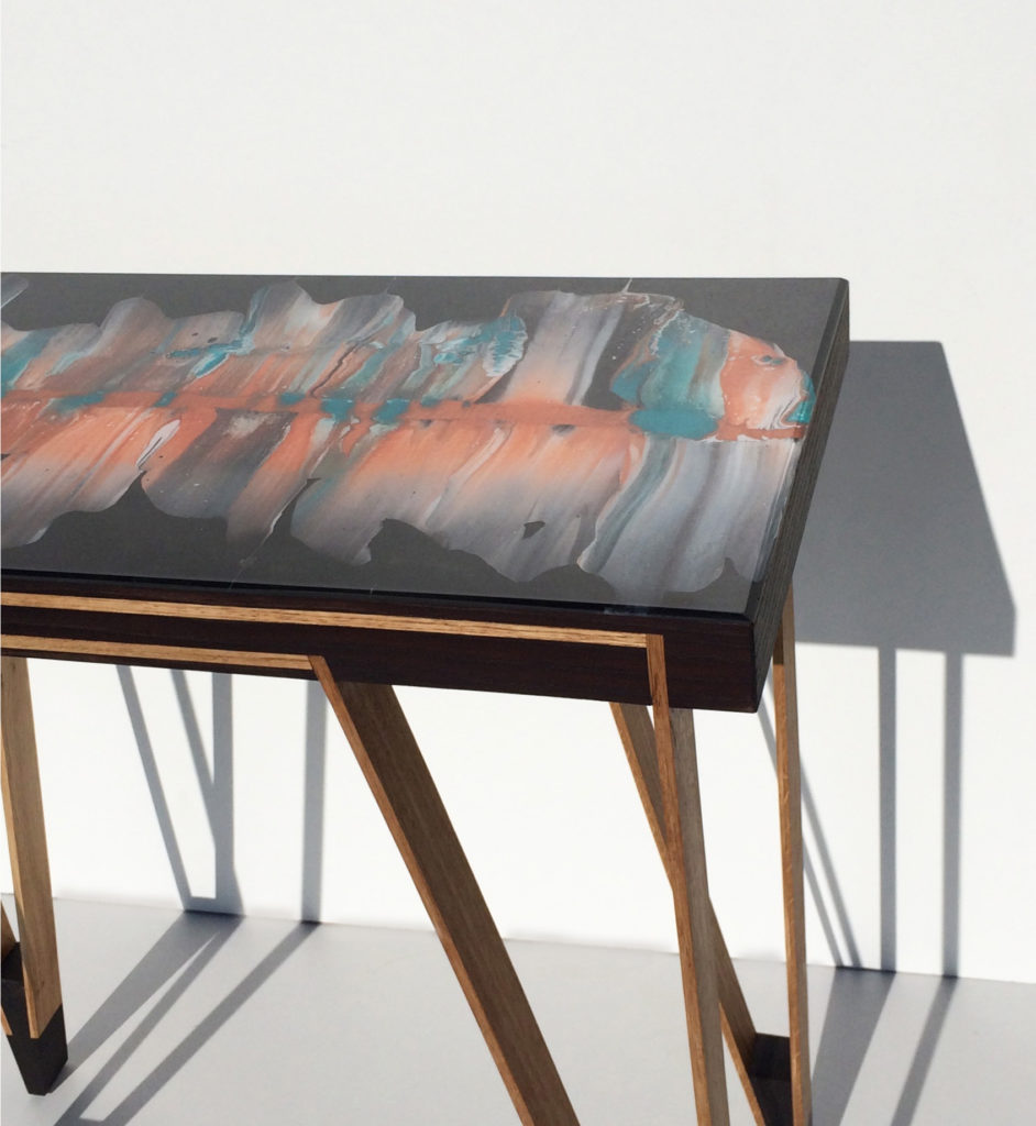 La singularité de cette console design tient à deux élements. La première chose est l’idée de traiter le plateau d’une table comme si c’était un tableau. Et la deuxième est l’envie de réaliser un piétement élégant, fin tout en étant stable et solide.