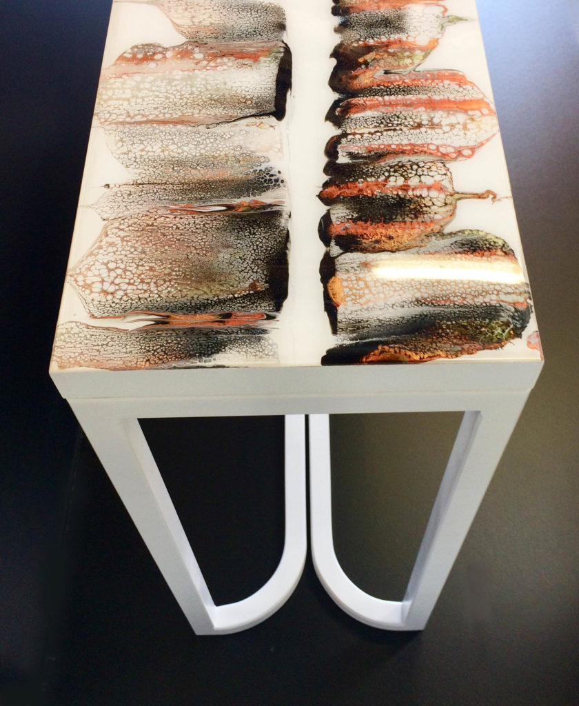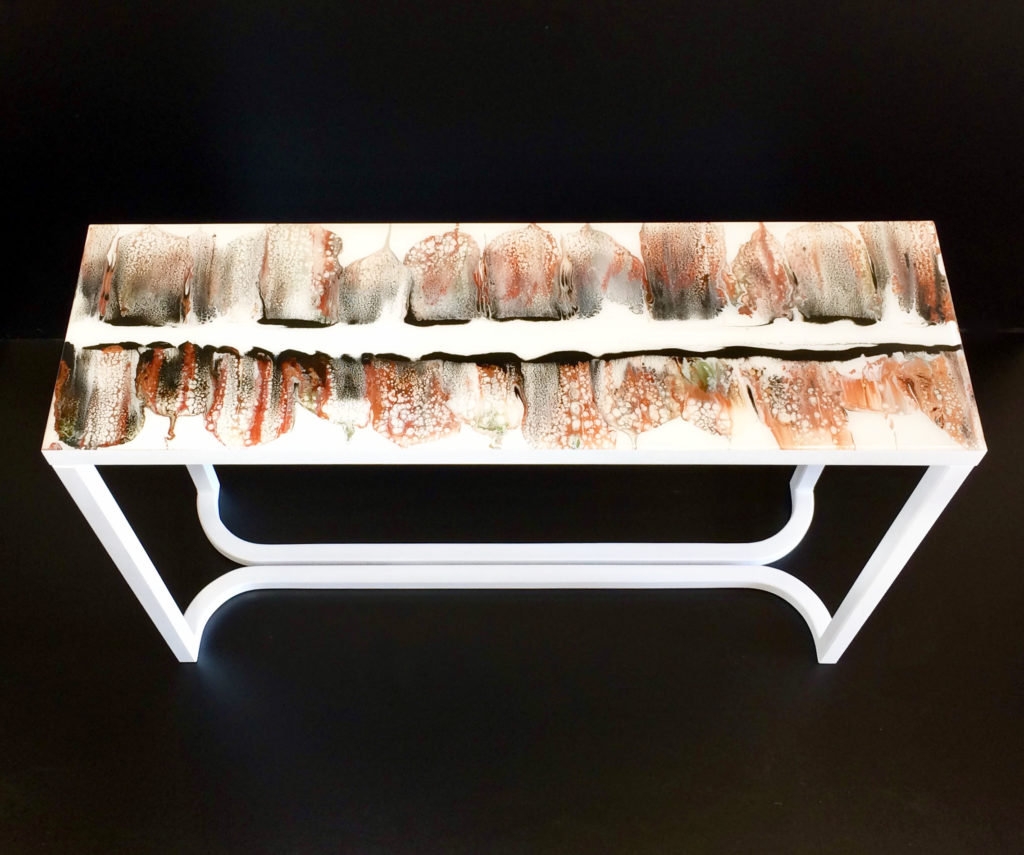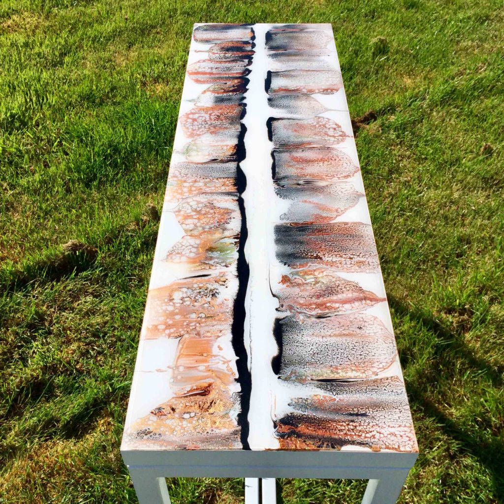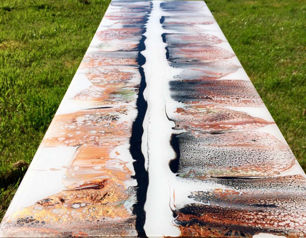 La peinture acrylique et la façon dont les couleurs se mélangent ne cesse de m’étonner et de me fasciner. La peinture acrylique chargée de pigments métalliques est particulièrement captivante par ses reflets lumineux. J’ai imaginé cette peinture comme une sorte d’horizon, un horizon ou la terre se reflète dans le ciel. Afin de protéger cette peinture, je l’ai recouverte de résine epoxy.