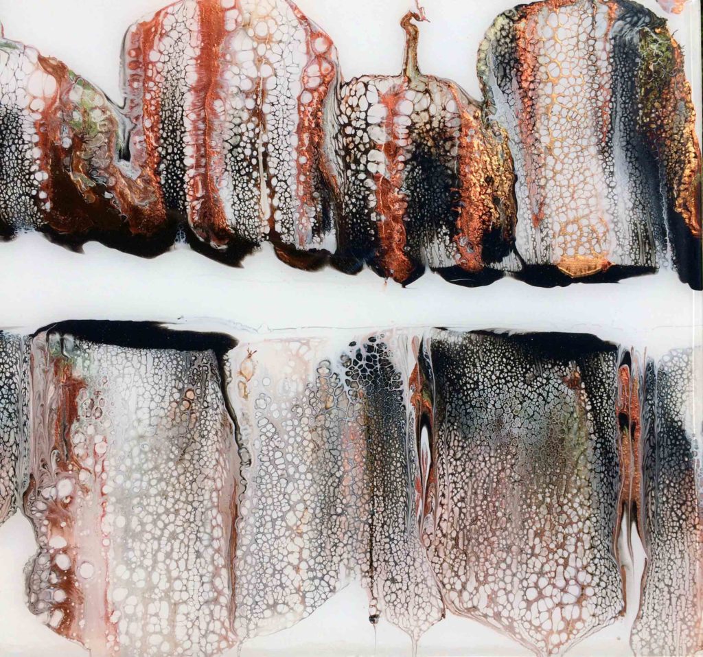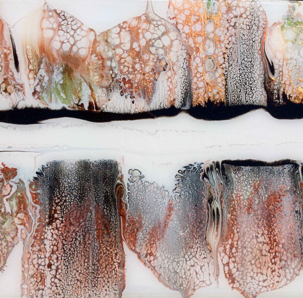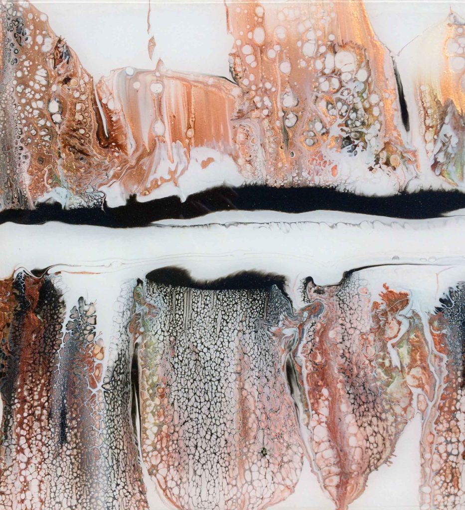La peinture acrylique et la façon dont les couleurs se mélangent ne cesse de m’étonner et de me fasciner. La peinture acrylique chargée de pigments métalliques est particulièrement captivante par ses reflets lumineux. J’ai imaginé cette peinture comme une sorte d’horizon, un horizon ou la terre se reflète dans le ciel. Afin de protéger cette peinture, je l’ai recouverte de résine epoxy.