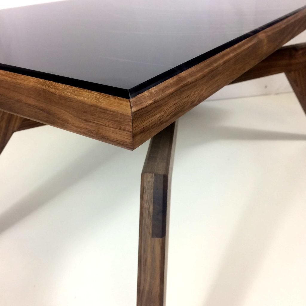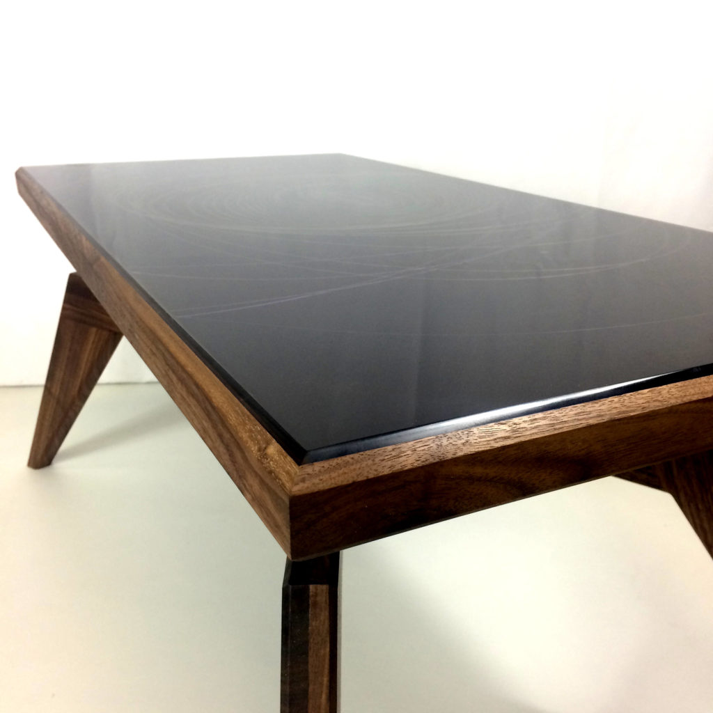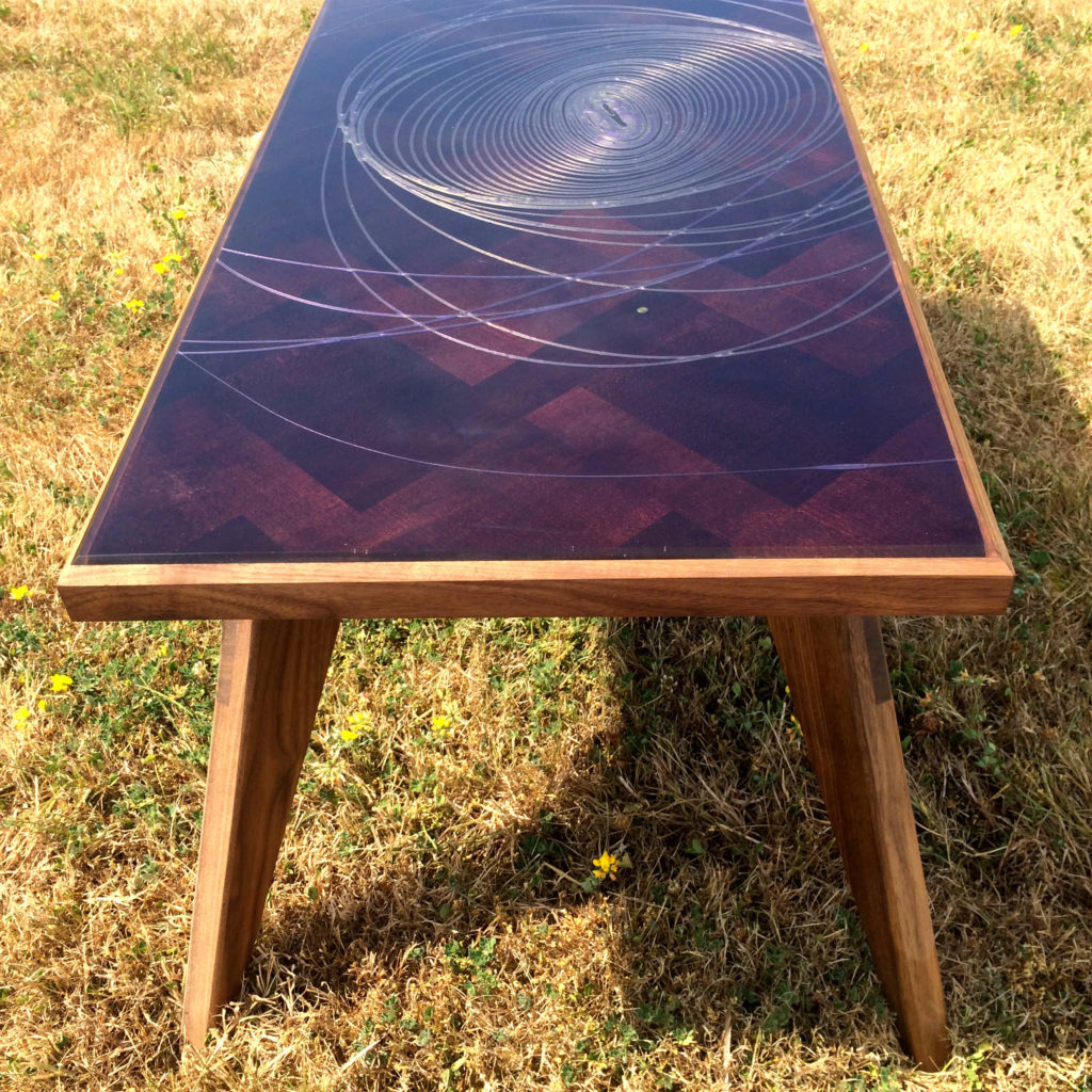 Le plateau de table est lui aussi réalisé en noyer. Cependant sur le dessus du plateau, en l’observant attentivement vous pourrez y voir un quadrillage de placage en hêtre. Avec du recul, je trouvais ce motif de placage un peu trop classique par rapport à l’esprit contemporain de la table. J’ai donc décidé de réaliser une composition personnelle en résine de couleur.