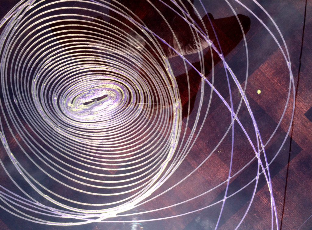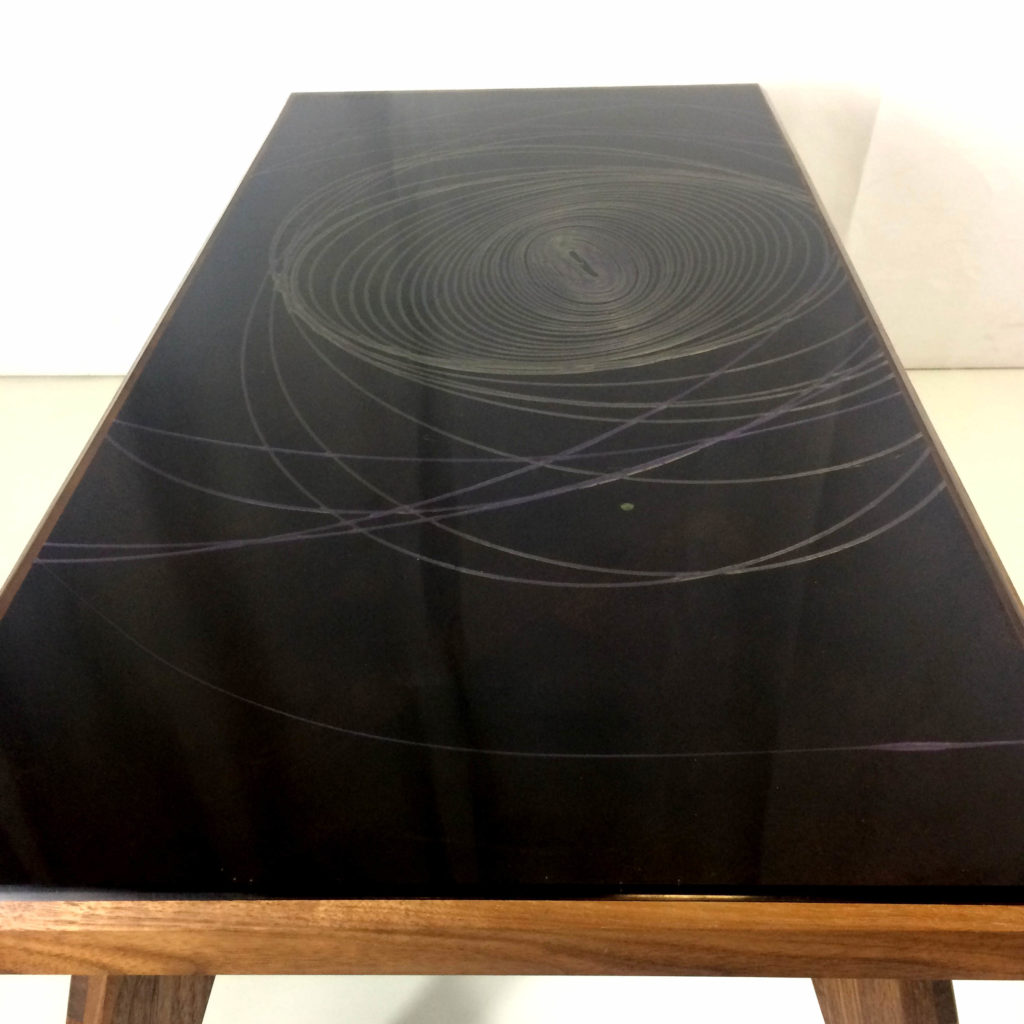 Cette forme elliptique particulière est mon petit secret de fabrication… Pour que cette réalisation tout en courbe soit harmonieuse, la manière de couler la résine de couleur doit être précise. Sur un fond très sombre, j’ai choisi pour ces ellipses au dessin quasi hypnotique, deux couleurs qui se fondent l’une dans l’autre, le vert et le violet. Une tablle basse comme celle ci, installée dans votre salon, ne laissera je l’espère pas indifférents vos invités 😉