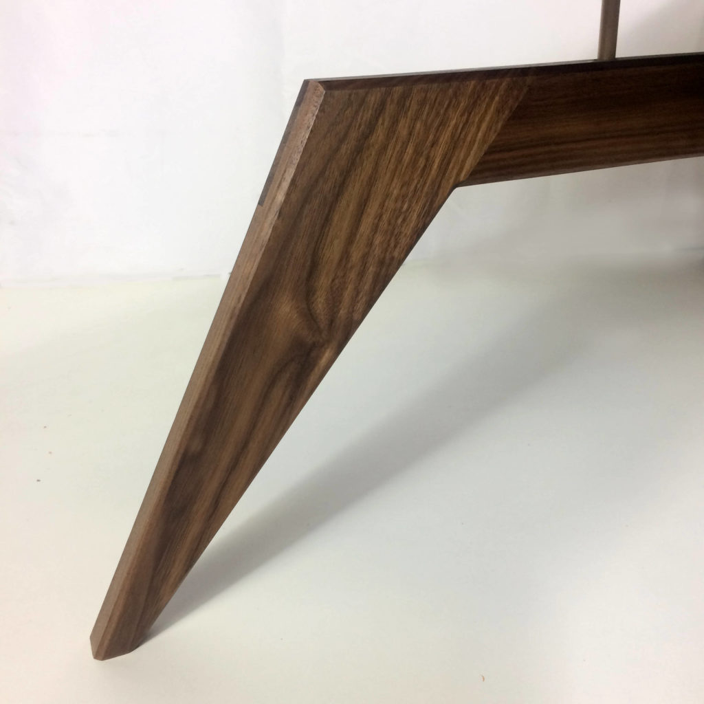 Au premier coup d’oeil, c’est son piétement étonnant chaussé sur des pivots en laiton qui interpelle. Les lignes anguleuses, et biseautées de ce piètement tout en noyer massif, lui donnent un look résolument contemporain. Mais l’originalité vient principalement de ces pivots en laiton qui suspendent le plateau de cette table basse design. Cela donne une impression double de solidité par les sections de bois massif mais également de légèreté par ce plateau suspendu.