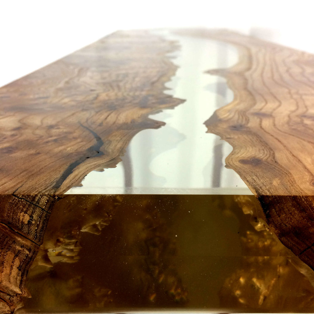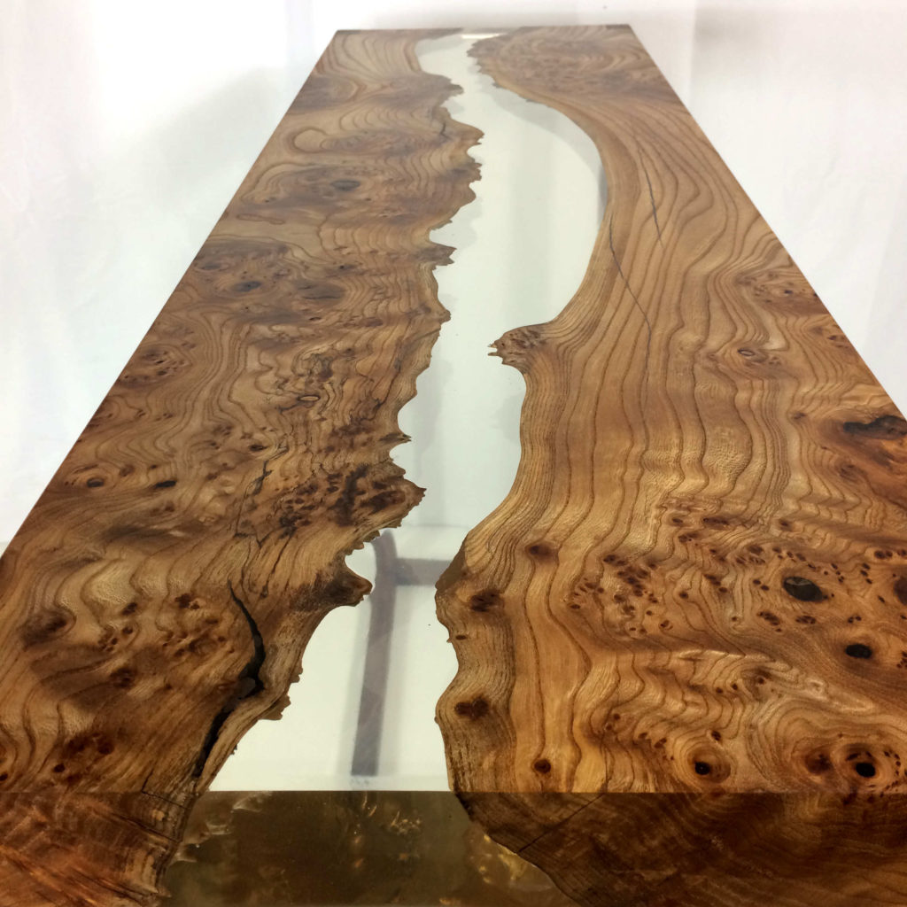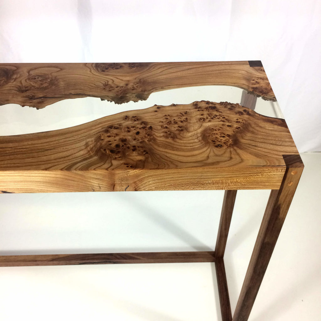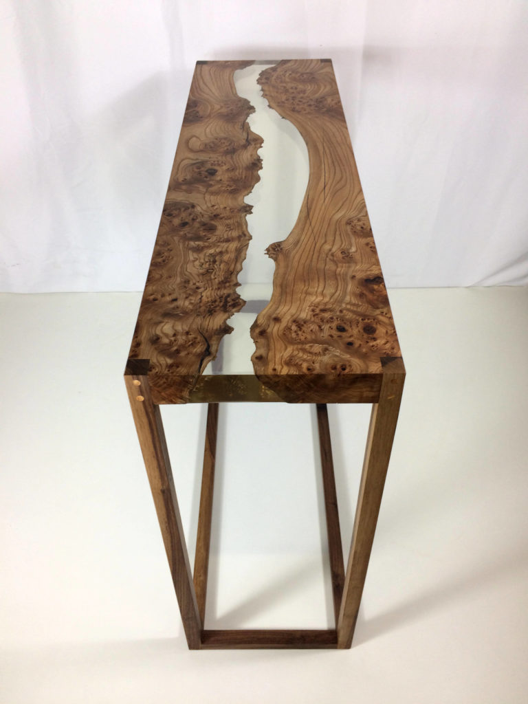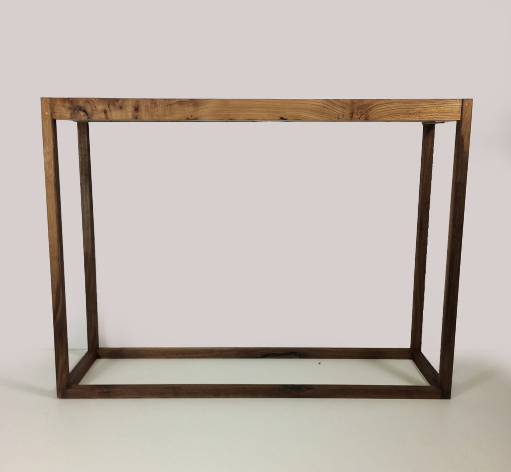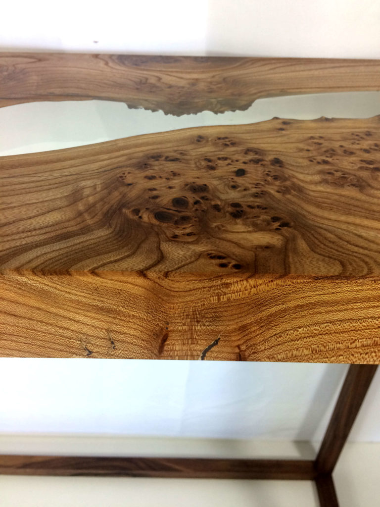 L’impression d’ensemble qui se dégage au premier regard de cette console est multiple. On est d’abord attiré par la beauté de la Loupe d’Orme et son coté massif et naturel. Ensuite la transparence entre les deux parties suscite la curiosité et l’étonnement. Enfin, sa conception simple rappelle, l’esprit épuré du style scandinave.