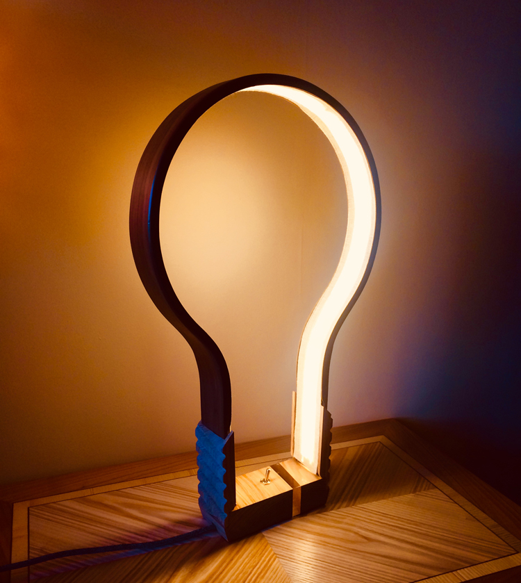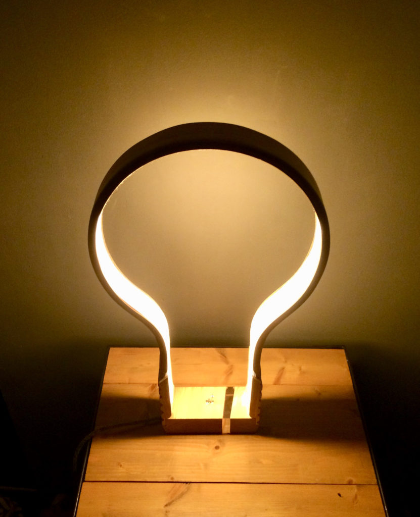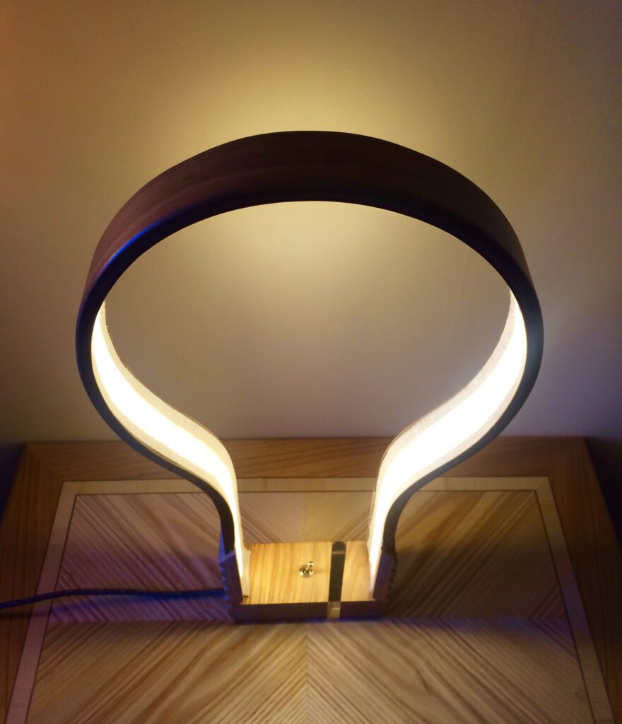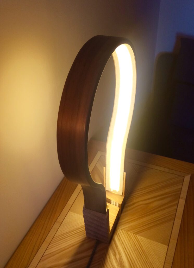 Après de nombreux essais, et en décidant d’assembler 3 fines lames (3mm) de noyer cintrées ensemble et en taillant une large rainure à l’intérieur pour y dissimuler les bandes de Led, le résultat me semble à la hauteur de mon idée première.