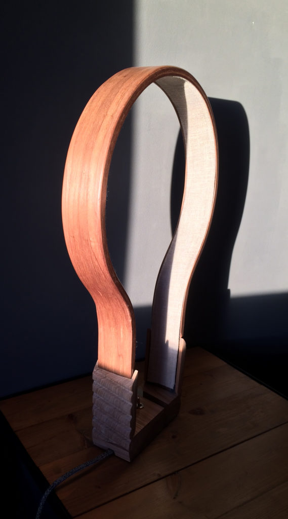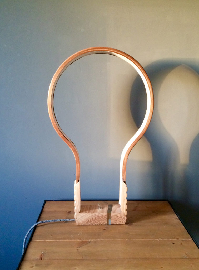 L’idée de départ de ce projet était double: mettre en oeuvre la technique du cintrage du bois et imaginer une lampe au design simple et épuré.