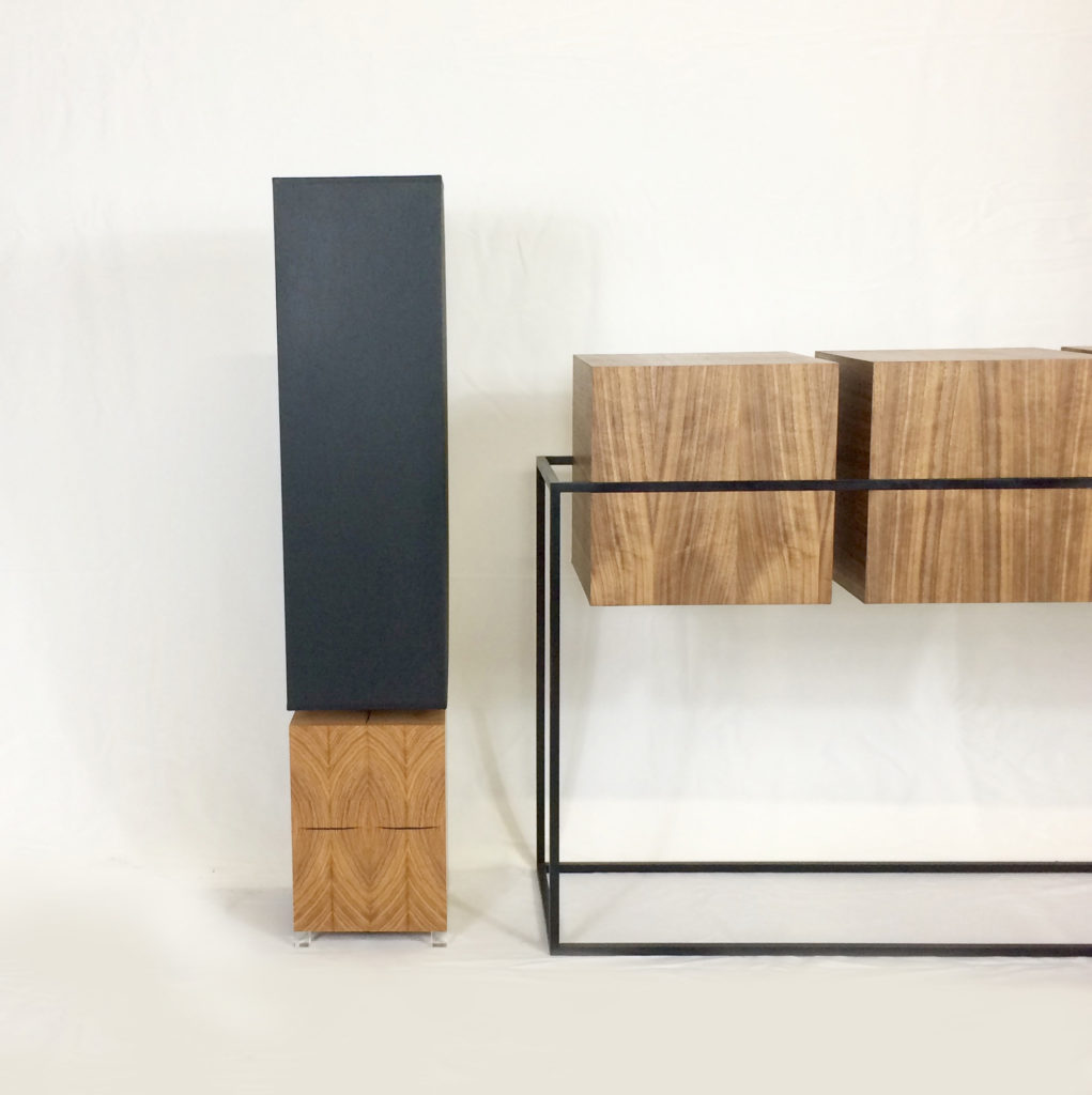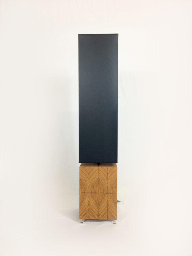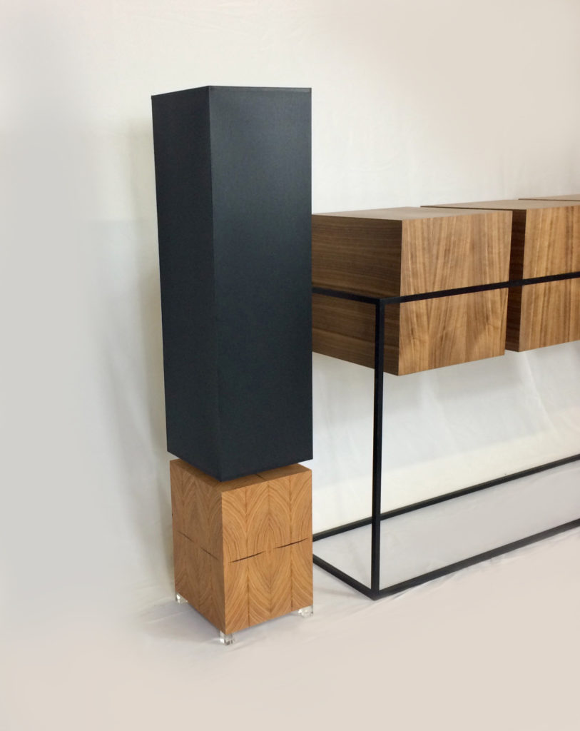 Chaque face de la base est composée de quatre lames. Chacunes découpées dans la même pièce de massif de Frêne Olivier. Et si vous regardez avec attention, vous remarquerez peut être qu’il y a un ordre précis dans la composition de cette lampe qui reprend l’ordre de découpe. Ainsi, contrairement à ce que peut laisser penser le premier coup d’oeil, non seulement chaque lame est différente, mais elle se suivent sur tout le tour de la base. Le Frêne Olivier est une essence de bois remarquable. Autant par sa couleur aux tons passant du sable au caramel que par ses dessins marqués et tranchants. Ce type de découpe que nous appelons dans le jargon des ébénistes « bois de bout », m’a semblé idéale pour cette lampe, rendant son assemblage très graphique et contemporain.