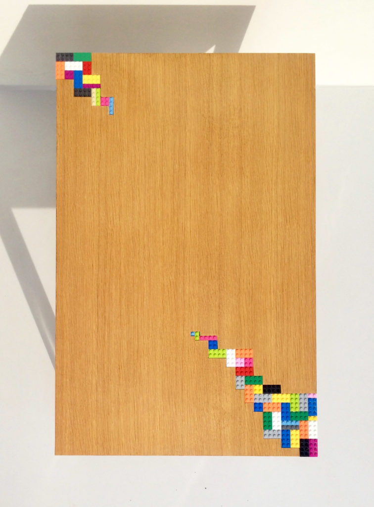 Cette table basse design est réalisée en Chêne et pièces de Lego. J’ai réalisé des entailles sur le plateau afin de pouvoir intégrer les Legos de manières à ce qu’ils soient au même niveau que la table. Faire en sorte que chaque pièce de LEGO soit parfaitement intégrée à la table est un véritable petit jeu… de patience !