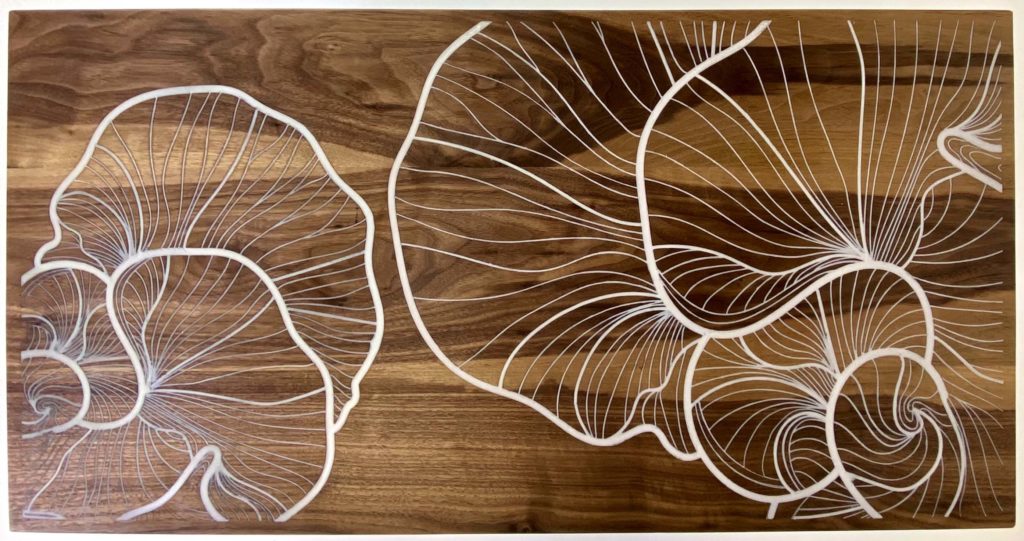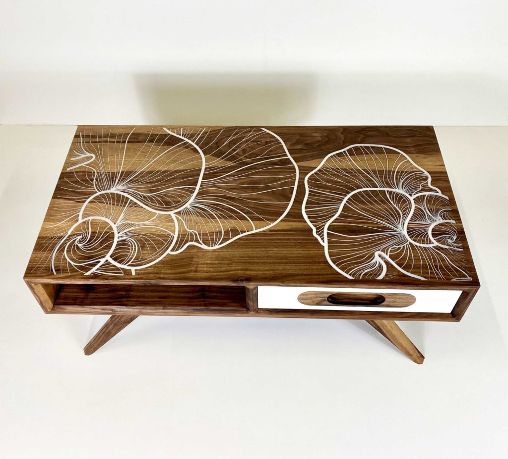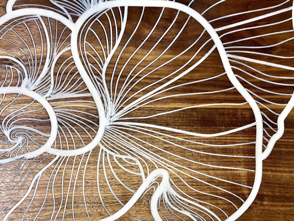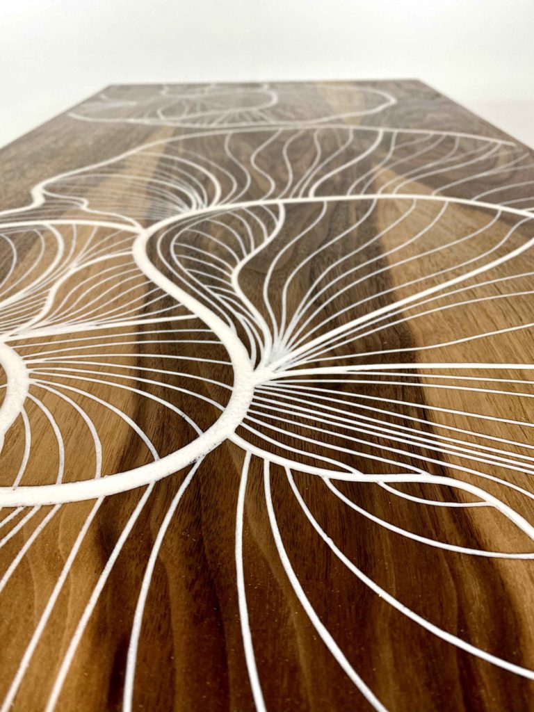 Le dessin de cette fleur imaginaire a été directement fraisé dans le bois massif du plateau sur quelques millimètres. Les espaces creusés ont ensuite été comblés par de la résine époxy couleur « nacre ». Cette fleur résistera donc parfaitement dans le temps.