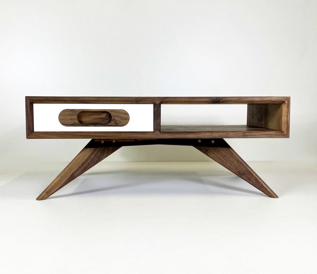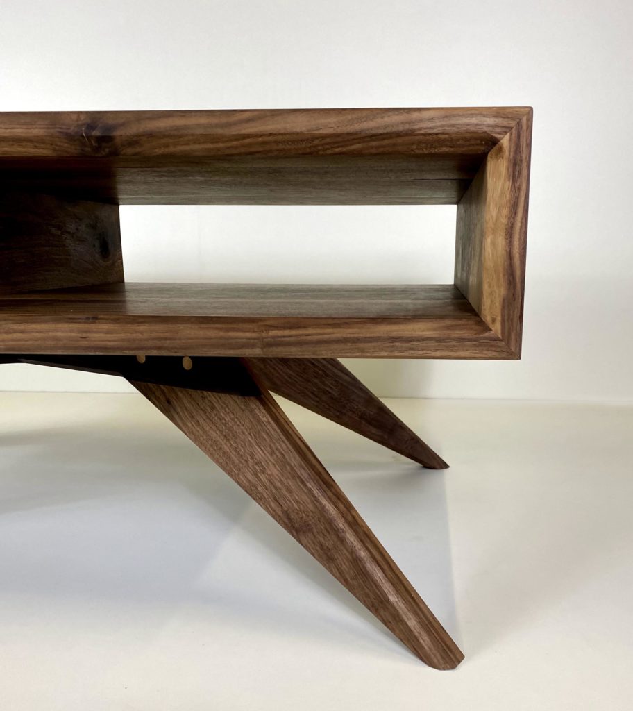 Entre mobilier et création artistique, j’ai envie de faire des mélanges. Cette table basse design en noyer massif en est un bon exemple. Ainsi, le plateau d’une table, n’est plus qu’un simple plateau mais aussi un tableau. Entre l’utile, le fonctionnel et le beau, il faut souvent faire des compromis. Pour cette table basse, l’équilibre entre ces extrêmes me semble cohérent.