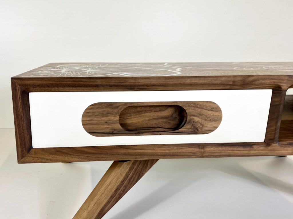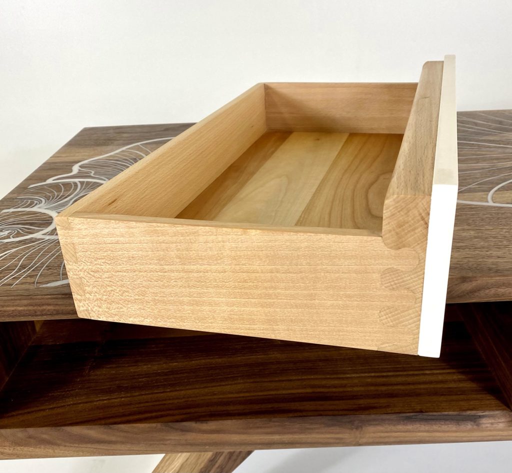 De chaque coté de la table, vous trouverez un tiroir dont la face est en Corian et en noyer. J’ai passé de nombreuses heures à la réalisation de ces deux tiroirs. Deux choses les rendent particulièrement uniques. Si vous regardez de près les assemblages du tiroir, vous remarquerez vite que ceux entre la face et les cotés sortent de l’ordinaire, en tout cas de l’ordinaire des queues d’arondes. La deuxième singularité réside dans le design de la poignée, tout en rondeur à l’extérieur et à l’intérieur.