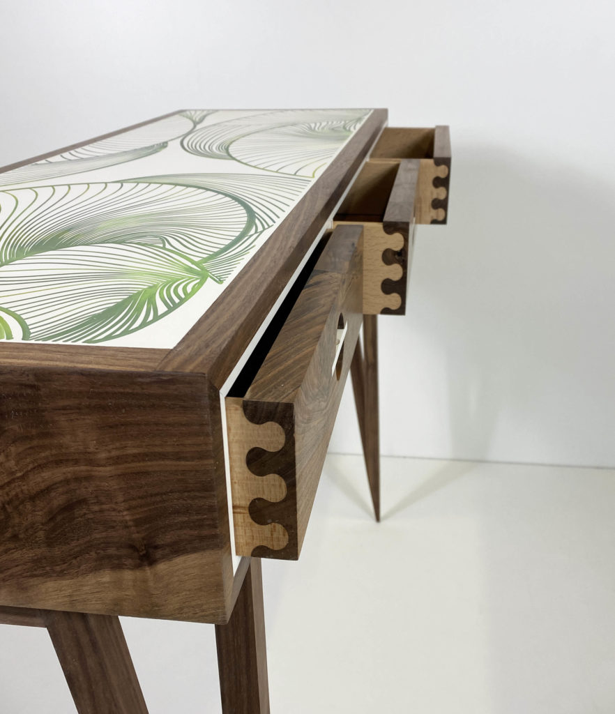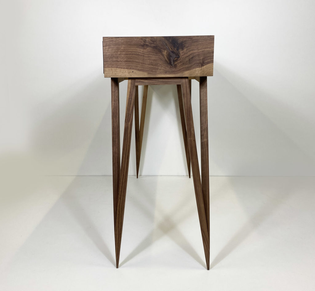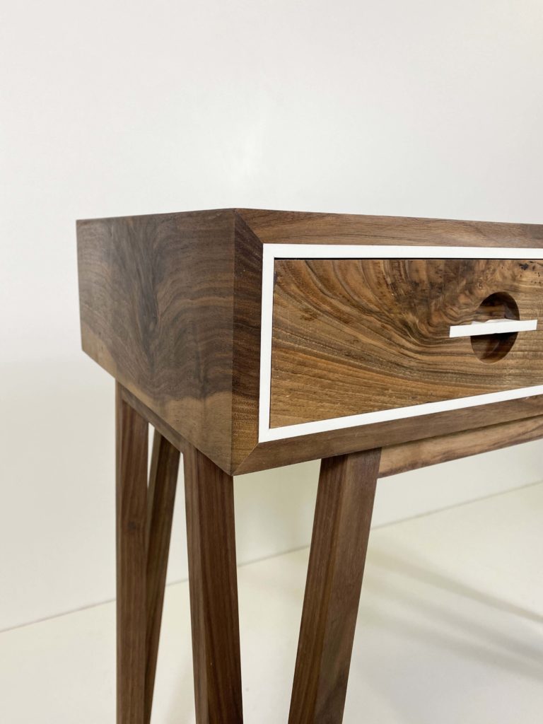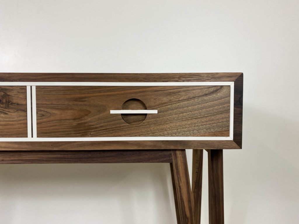 Cette console revient de loin. La table contenant les tiroirs était initialement entièrement conçue en Corian. Un matériau synthétique ayant des propriétés étonnantes : à la fois très dur et résistant mais aussi fragile s’il reçoit un coup ou tombe. Elle était complètement terminée quand je l’ai malencontreusement fait tomber sur le coté… Un des angles a éclaté sur deux centimètres, la rendant en l’état, irréparable. Heureusement le plateau du dessus était resté intact et après diverses hésitations, j’ai décidé d’intégrer le plateau dans un cadre en noyer. Elle pourrait tomber à nouveau, mais les angles ne se casseront plus.