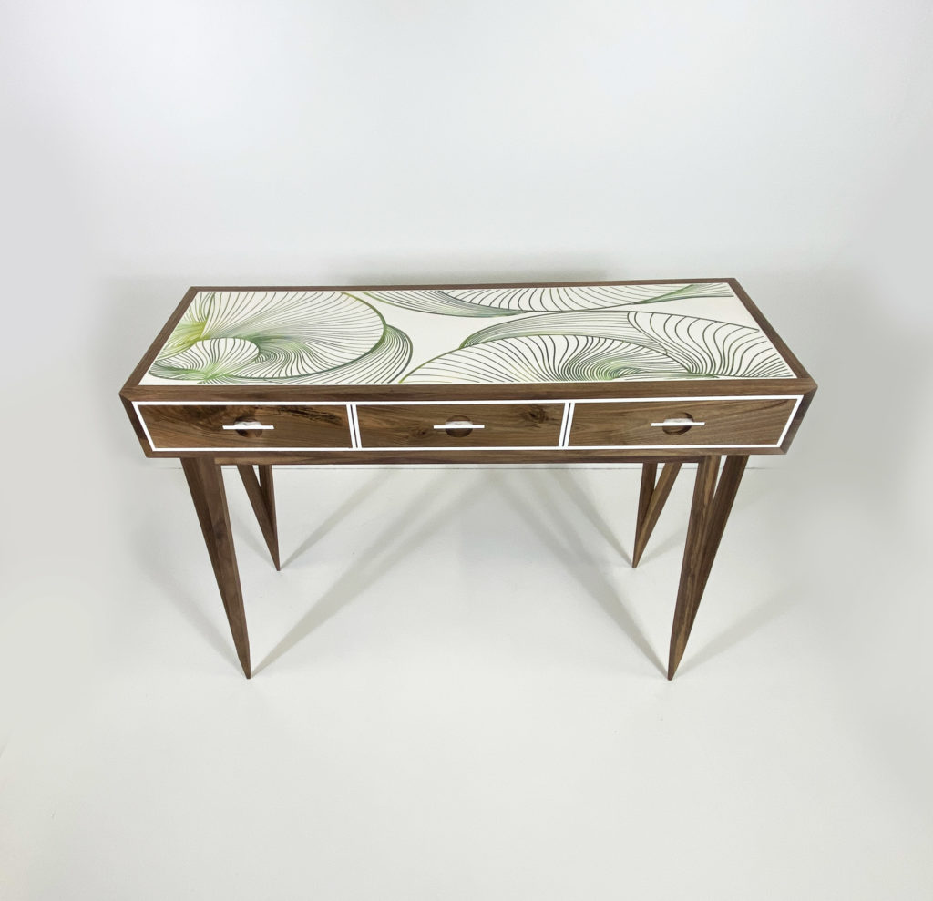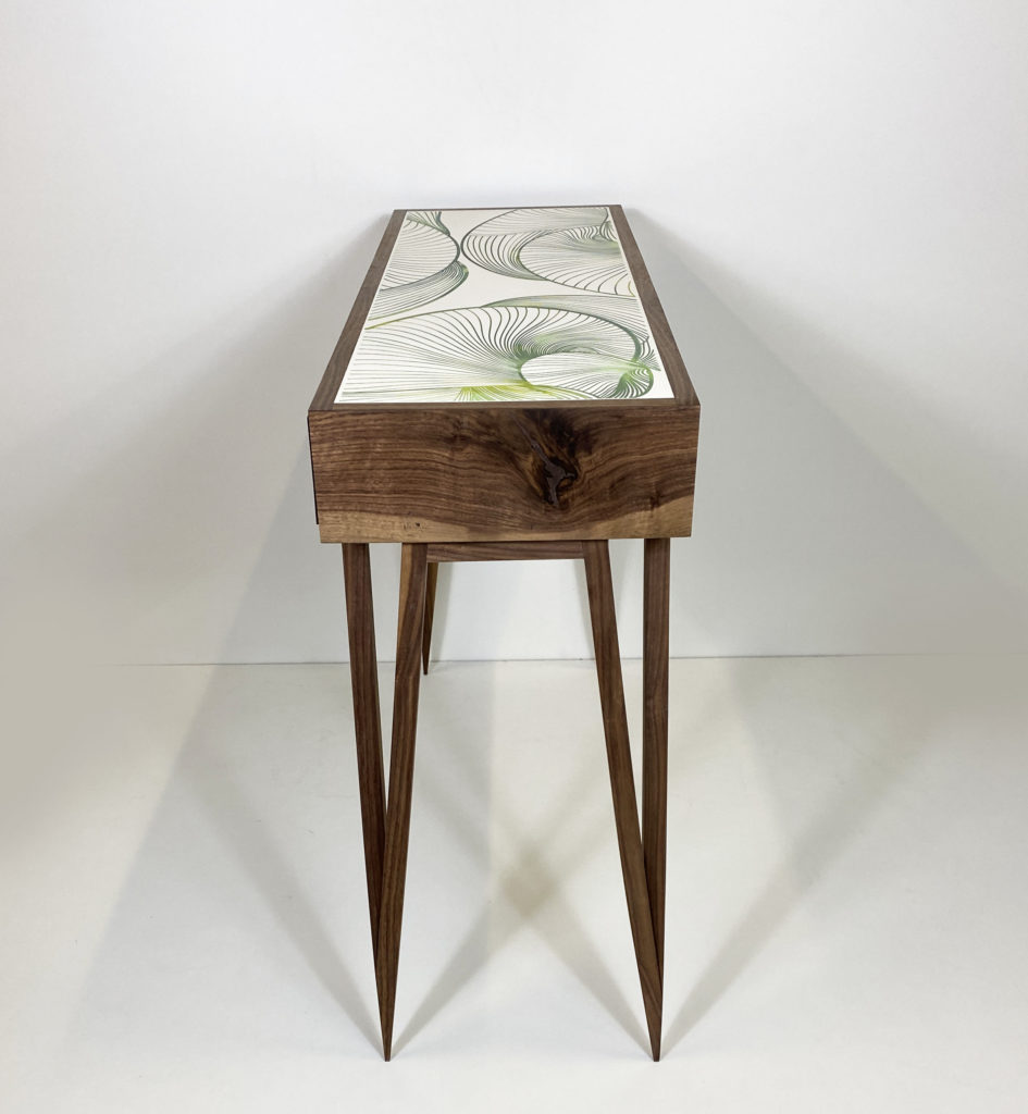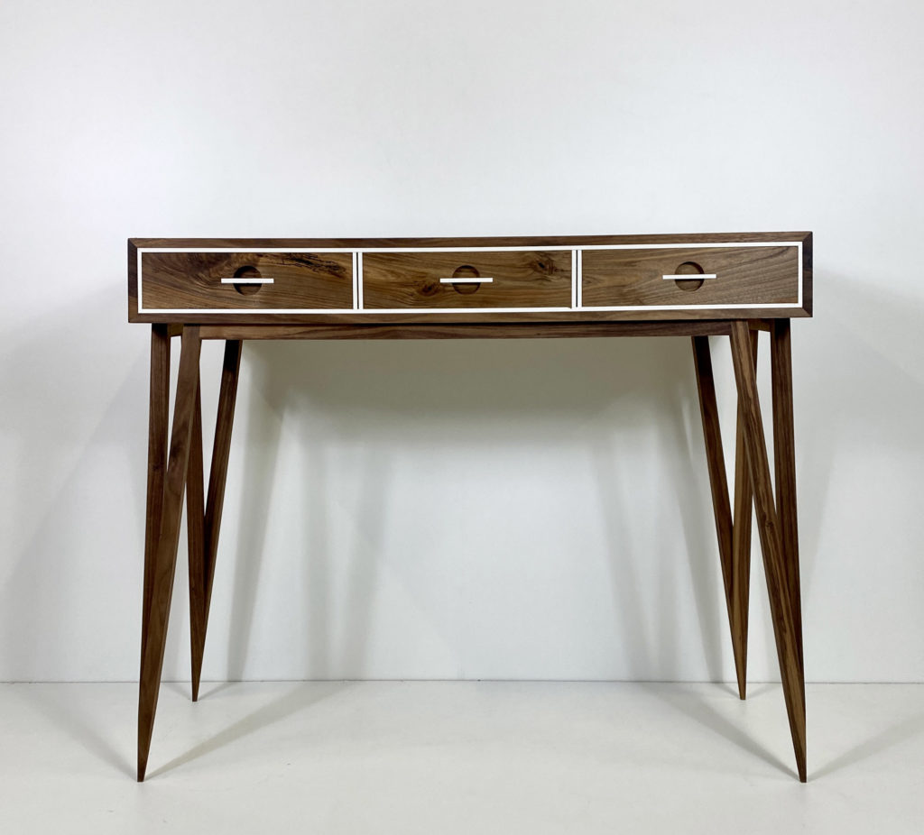 Cette console revient de loin. La table contenant les tiroirs était initialement entièrement conçue en Corian. Un matériau synthétique ayant des propriétés étonnantes : à la fois très dur et résistant mais aussi fragile s’il reçoit un coup ou tombe. Elle était complètement terminée quand je l’ai malencontreusement fait tomber sur le coté… Un des angles a éclaté sur deux centimètres, la rendant en l’état, irréparable. Heureusement le plateau du dessus était resté intact et après diverses hésitations, j’ai décidé d’intégrer le plateau dans un cadre en noyer. Elle pourrait tomber à nouveau, mais les angles ne se casseront plus.