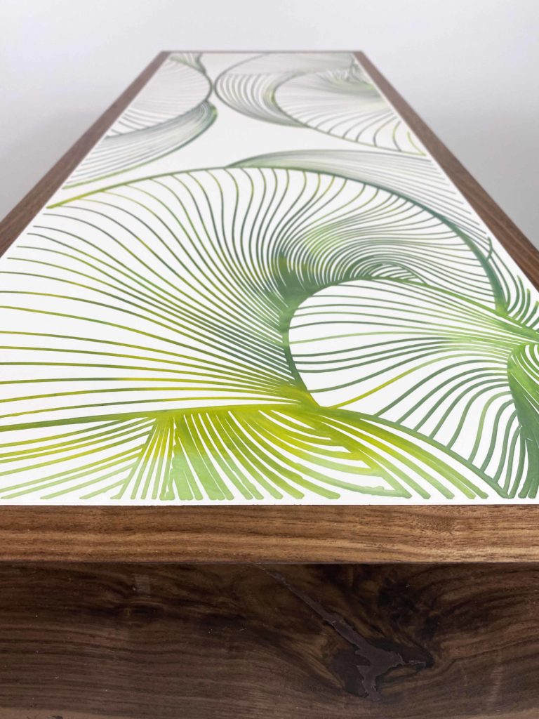Cette fleur étrange est gravée dans le Corian. Ensuite j’ai coulé de la résine epoxy avec un camaïeu de vert afin de rendre l’ensemble aussi naturel que possible.