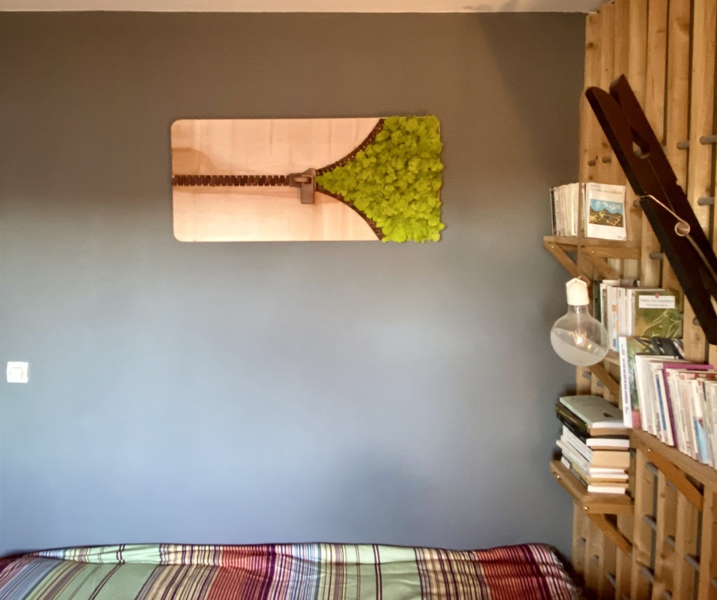 Ce tableau en bois et Lichen stabilisé est le premier que je conçois. Il raconte une page de mon histoire.