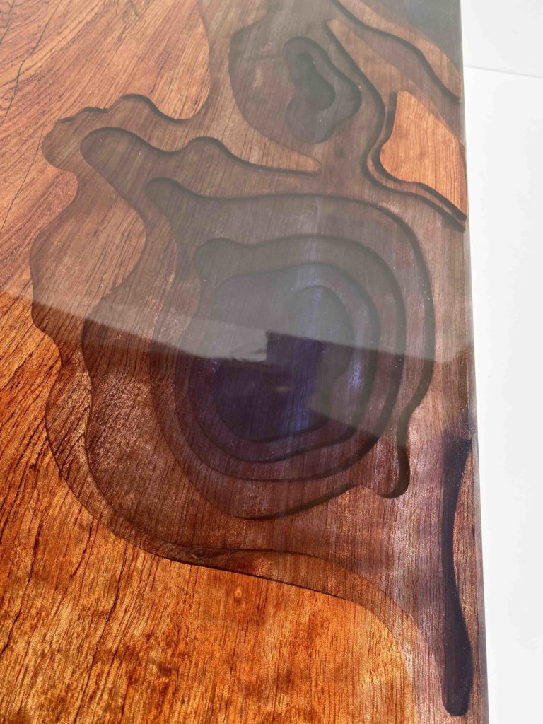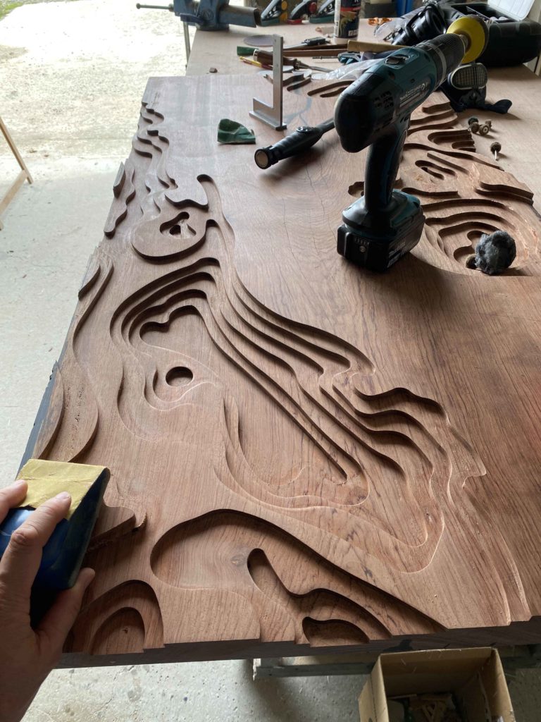 Le bois est un matériau tellement beau, que quand vous le creuser vous pouvez encore suivre les enchevêtrements de ses « fils ». Sachant cela, j’ai voulu sculpter différents étages pour suivre dans l’épaisseur du plateau, les lignes de son bois.