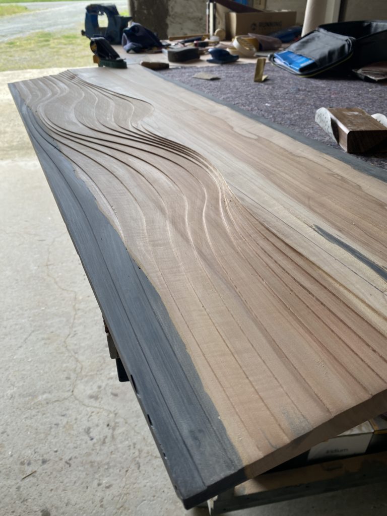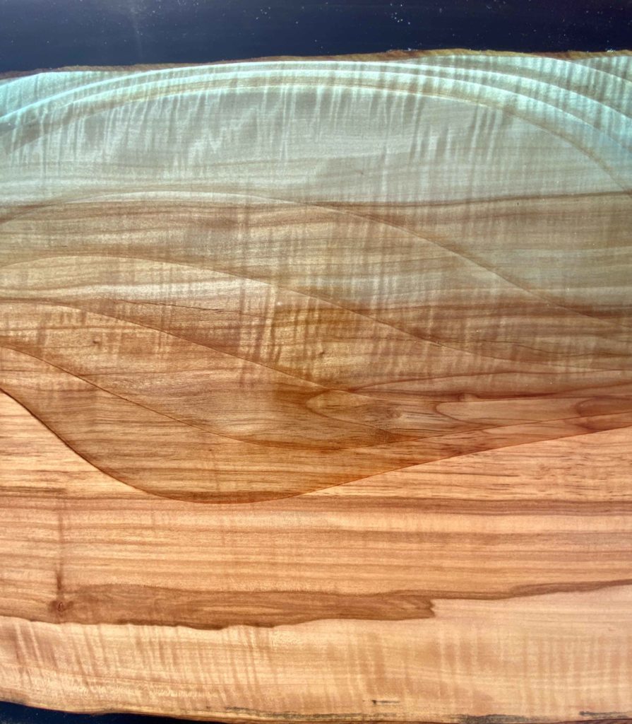 Le thème de la mer et de ses vagues s’est vite imposé pour ce projet. La couleur dorée du Poirier convenait bien pour la plage, il fallait ensuite façonner les vagues. J’ai donc dessiné et sculpté ces vagues dans l’épaisseur du bois, et rempli le vide par une résine transparente légèrement bleutée.