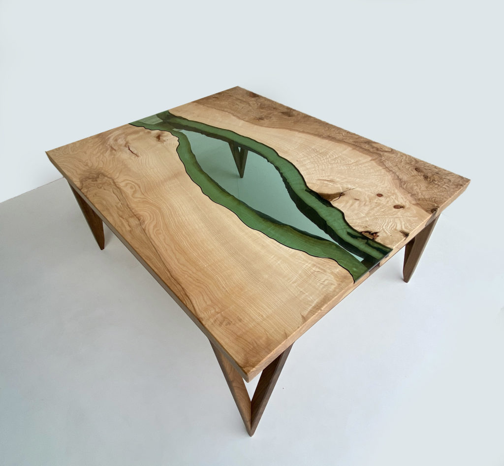 Cette table basse design bois et verre est une version revisité des table basses dites « rivières », intégrant de la résine epoxy.