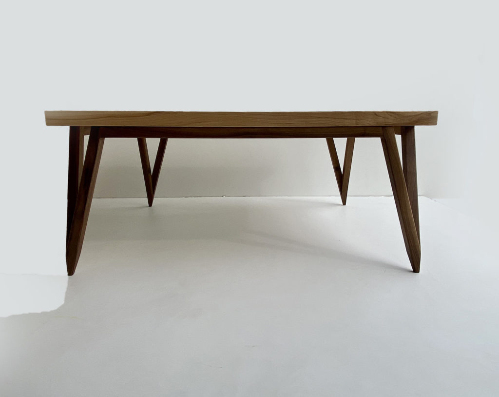 Les dimensions de ce plateau de table sont généreuses : 105 cm X 86 cm, épaisseur 4 cm. De fait cela nécessitait à mon sens un design de piétement lui donnant une impression de légèreté. J’ai utilisé à nouveau le design de piétement que j’avais conçu pour la console « Fixuma ». J’aime énormément ce design de piètement qui tout en étant robuste donne cette impression de suspension et de légèreté. Le piètement est réalisé en noyer massif.