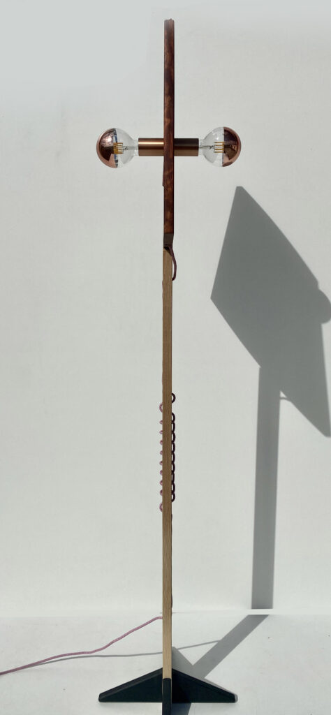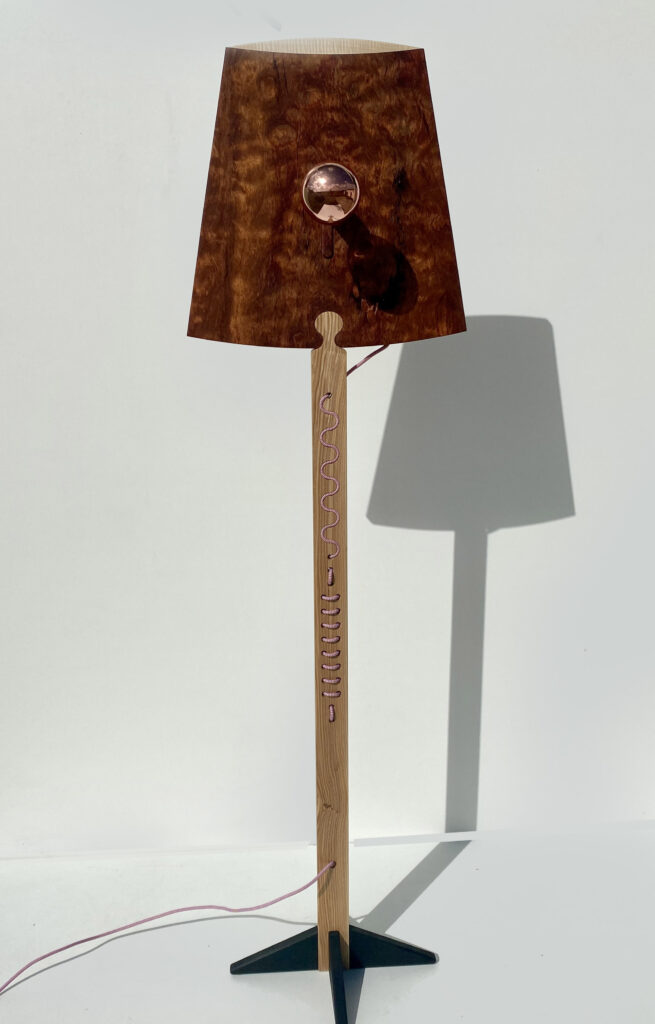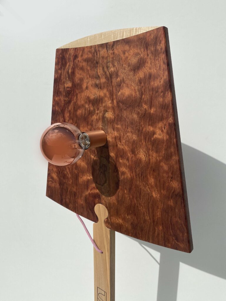 « Ombre » réinterprète le lampadaire classique en lui donnant une présence graphique singulière. De face, l’abat-jour évoque l’icône 2D de l’objet ; en volume, le bois révèle ses reflets cuivrés et sa profondeur. La lumière souligne ce double registre : ample, lisible, confortable, jamais agressive.