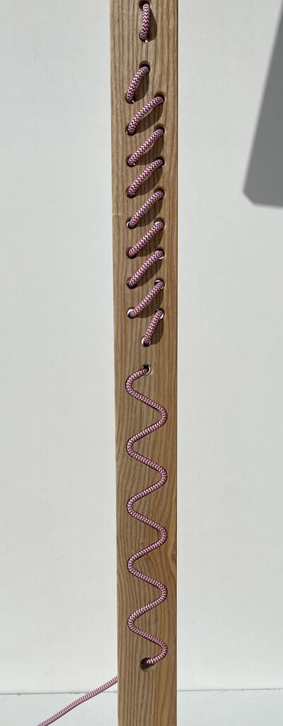 Le parti pris de design intègre le câblage comme élément visuel à part entière. Masqué dans la partie haute de l’abat-jour, il redevient visible sur le pied et accompagne la ligne verticale : une signature discrète, ludique et cohérente. Le pied en frêne/hêtre teinté noir apporte stabilité et contraste, pour une emprise au sol réduite et une intégration facile dans le salon, un coin lecture ou le long d’une bibliothèque.
