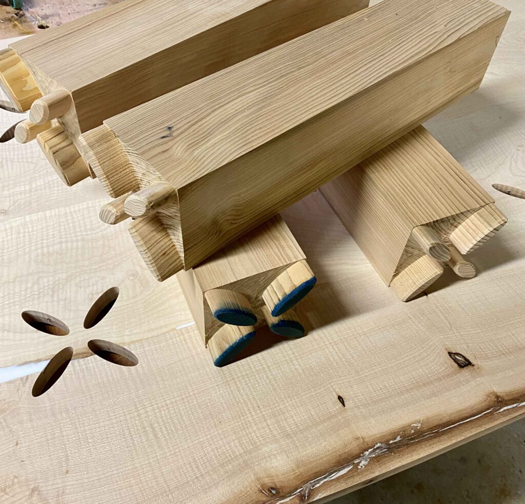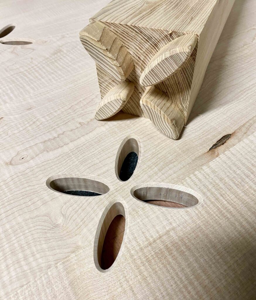 Le plateau agit comme la mortaise, tandis que les pieds en forme de fleur viennent s’y insérer avec précision.