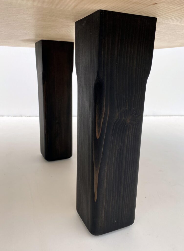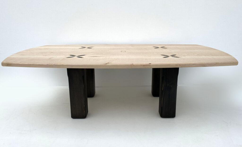 Sur le plan technique, la table fait écho à un assemblage traditionnel d‘ébénisterie, le tenon-mortaise, revisité dans une lecture contemporaine.
