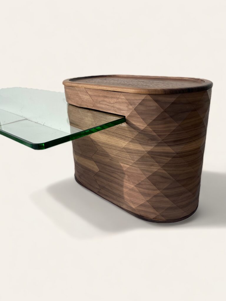 Les trois pieds, habillés d’une membrane de marqueterie en relief, lui donnent un caractère sculptural unique. Chaque détail a été pensé pour marier la rigueur géométrique du verre et la chaleur du bois.