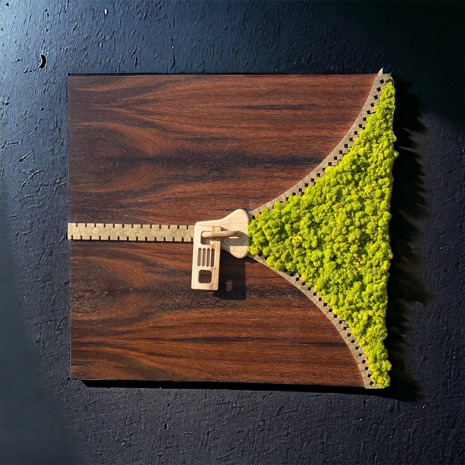 À travers la fermeture éclair sculptée, on découvre une surface de lichen stabilisé, un végétal naturel qui garde son aspect sans entretien, ni lumière, ni eau. Ce mélange de bois et de végétal donne à la pièce un caractère vivant, presque apaisant.