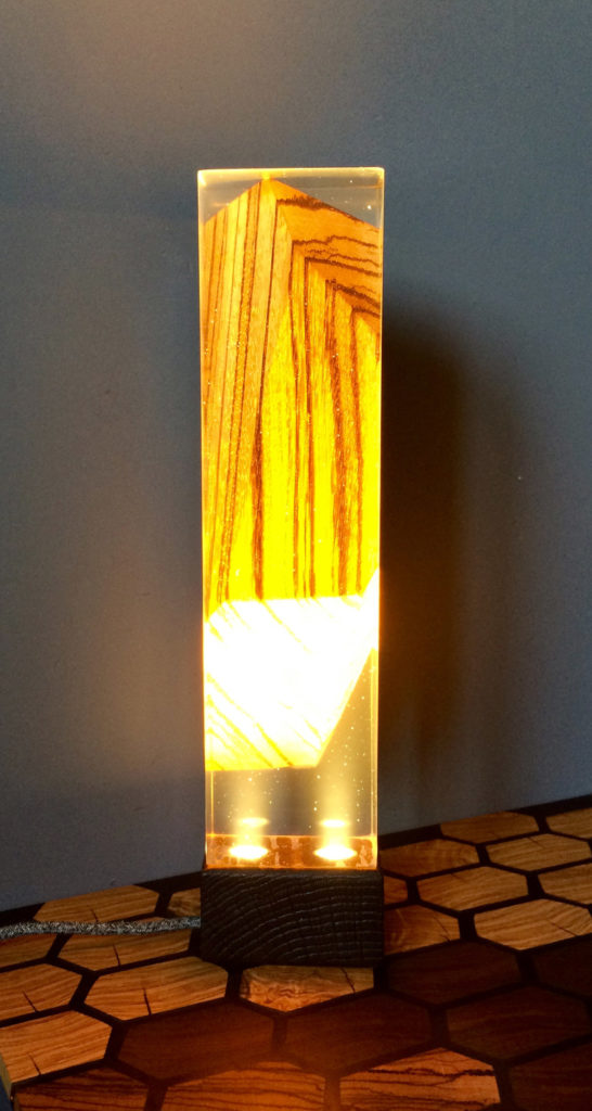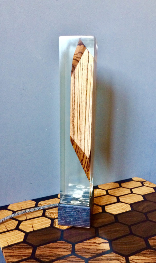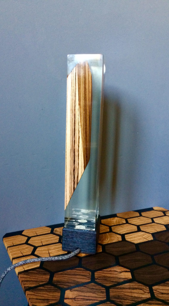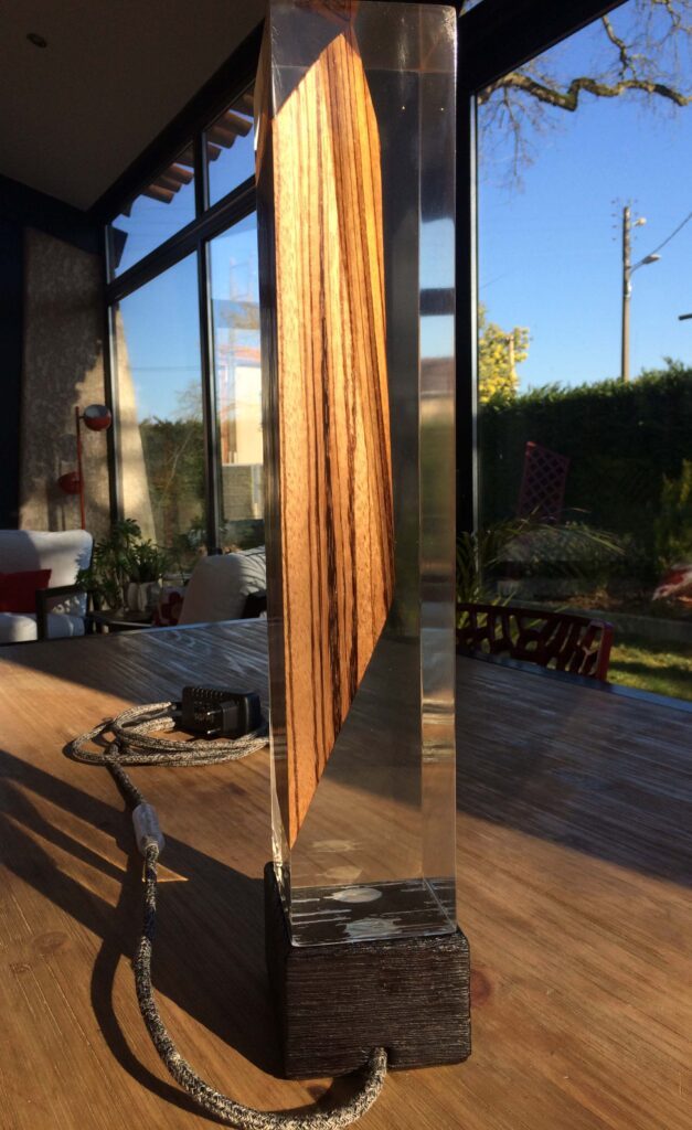 Cette lampe « Apesanteur » est réalisée en Zébrano massif, bois exotique d’Afrique de l’ouest. La base est en chêne clair travaillé avec la technique Japonaise de bois brulé (Shou Sugi Ban) et résine époxy. Deux lampes led (démontables) y ont été intégrées.
