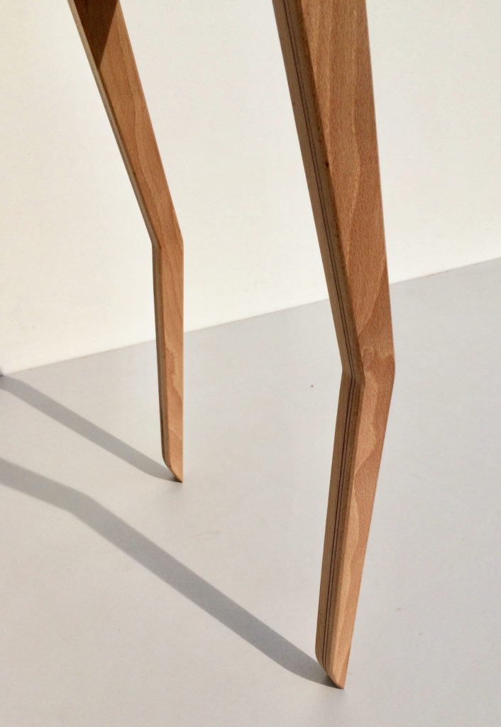 Chaque pied est un assemblage de cinq éléments différents. Trois pieces de frêne et deux fines feuilles de placage sombre placées dans la longueur du pied lui donne de l’élégance tout comme le filigrane d’un bas de soie. La forme unique des pieds parachève la singularité de ce guéridon design qui saura s’intégrer dans de nombreux intérieurs.