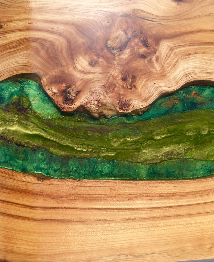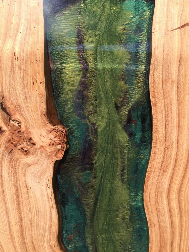 Je l’ai nommée « Amazonia », car l’idée était de donner un coté sauvage à cette rivière. De plus, les rives sont ces deux pièces de loupe d’orme de grande beauté. Quand vous la regardez de près, vous pouvez vite être captivé par ces formes et ces couleurs étonnantes. C’est une table rivière qui je l’espère titillera votre imaginaire.