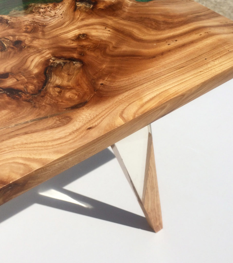 Les pieds réalisés avec du Frêne Olivier et de la résine epoxy donnent l’impression que le plateau de la table est en lévitation sur les quatre « pics » du piétement.