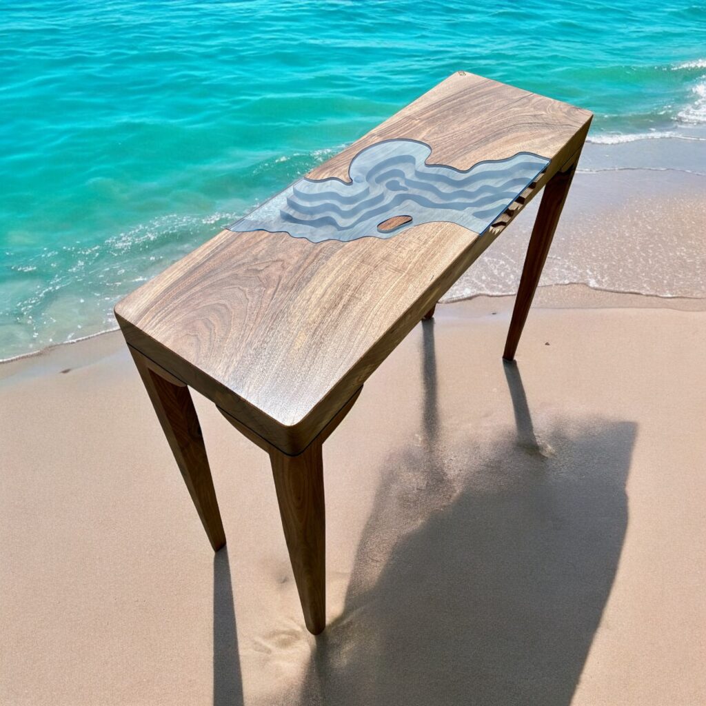 Dès le premier regard, cette console contemporaine séduit par son design épuré et son équilibre harmonieux entre sobriété et caractère. Son plateau, en verre découpé sur mesure, s’accorde parfaitement avec la chaleur du bois, créant un contraste subtil et poétique. Cette association évoque la rencontre entre la terre et l’eau, entre la matière et la lumière.