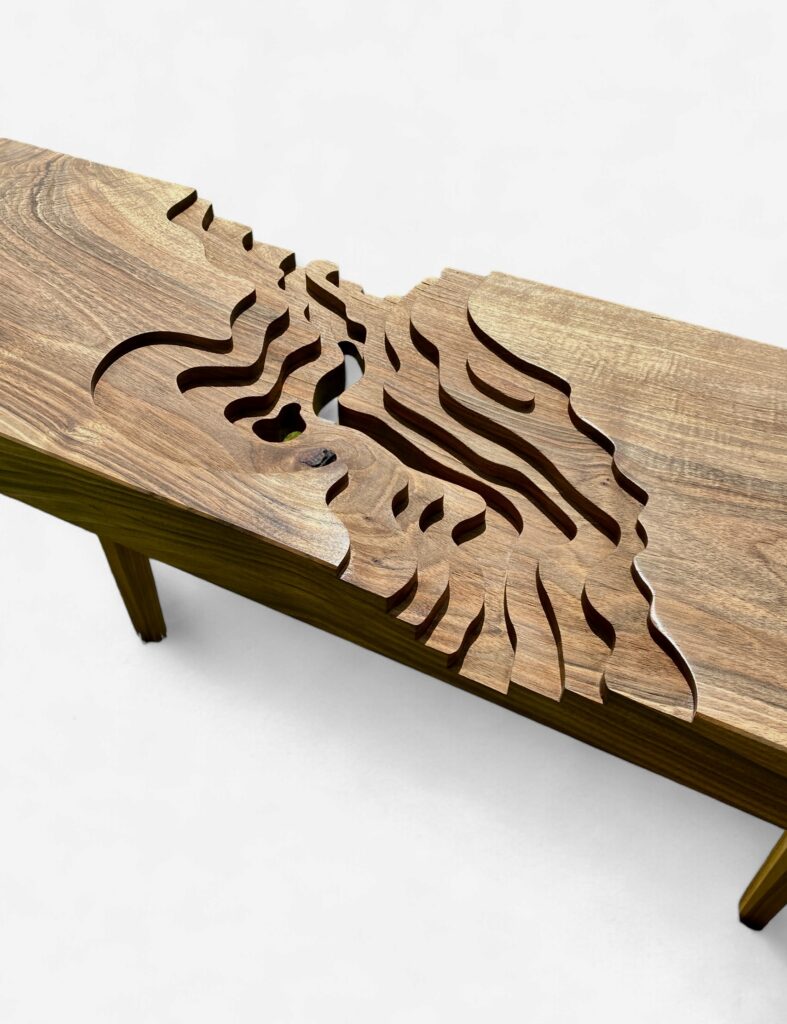Même sans son relief topographique, la console Lagon attire l’œil. Son secret réside dans le choix de l’essence de bois : le noyer français. Cette essence rare et précieuse se distingue par la richesse de son veinage, aux nuances allant du brun profond au beige doré, ponctuées parfois de reflets rosés ou verdâtres. Chaque planche est unique, faisant de chaque console une pièce singulière.
