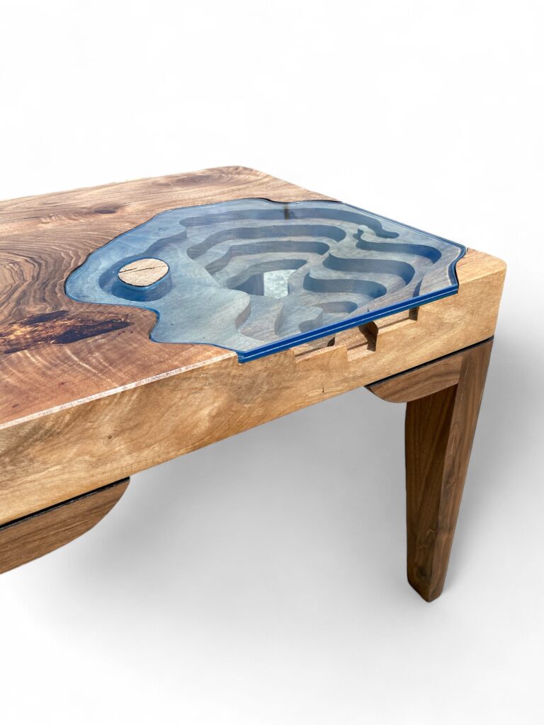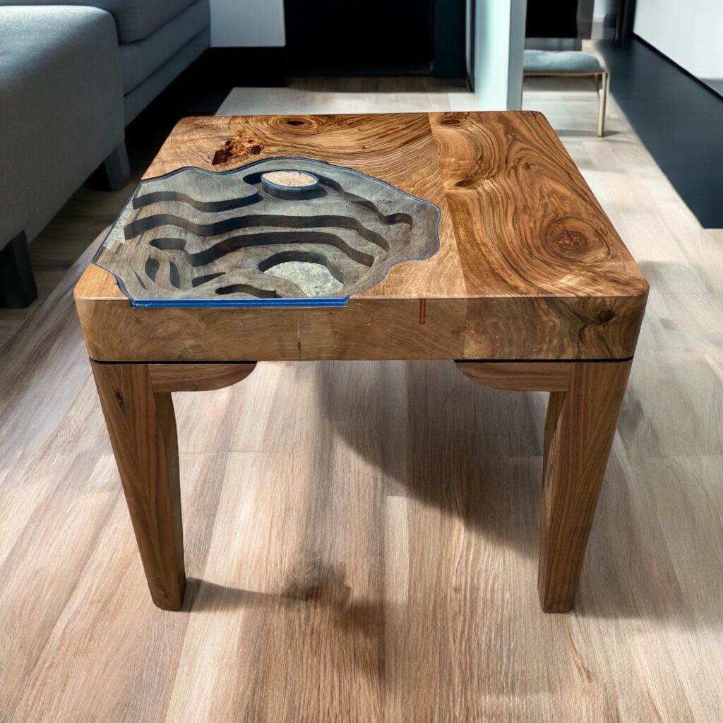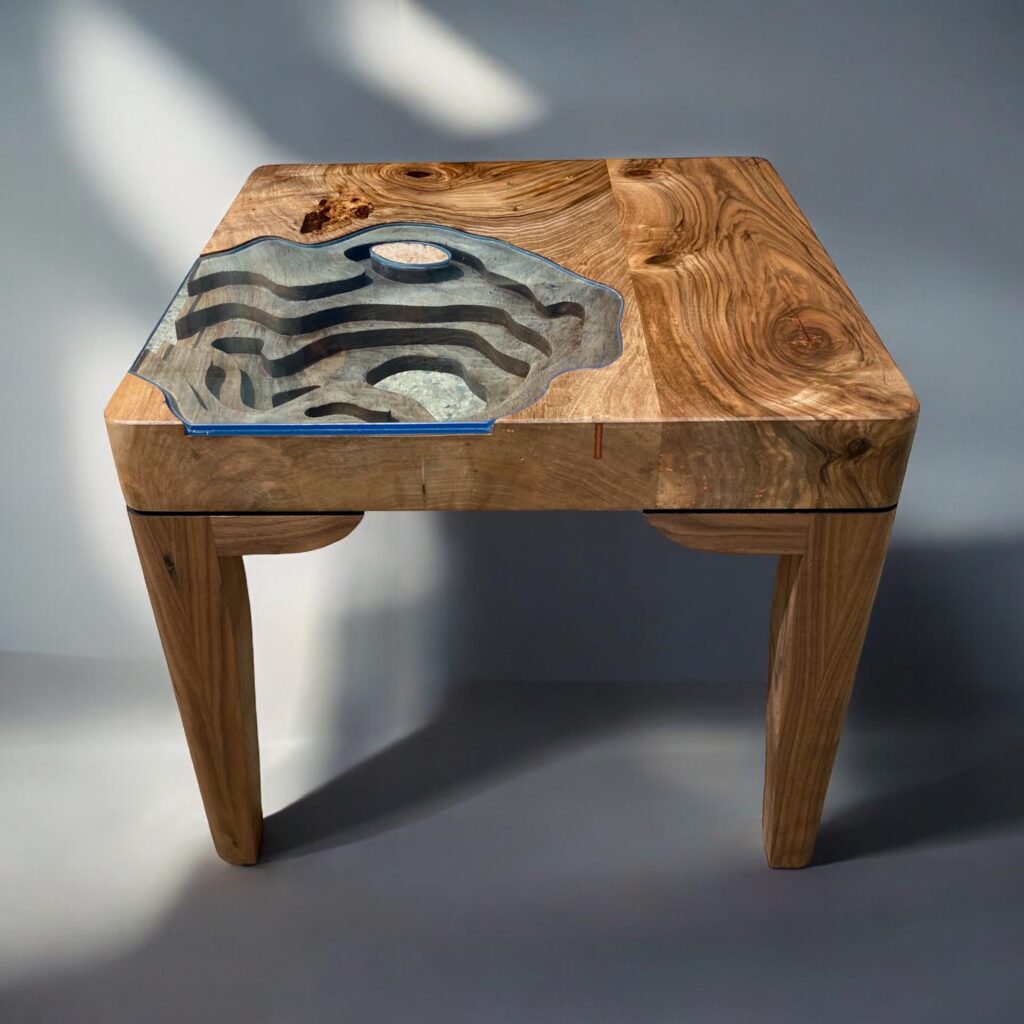 Son plateau en verre, découpé sur mesure, semble flotter au-dessus du bois massif, évoquant la rencontre entre la transparence de l’eau et la chaleur de la terre.