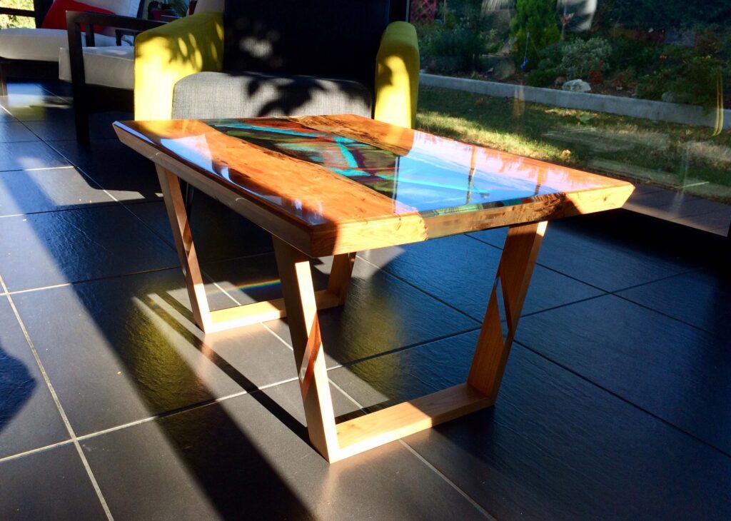 Pour cette table basse en « vieux poirier« , j’ai voulu faire à nouveau une table rivière. Mais cette fois ci en y créant une rivière aux couleurs et au dessin contemporain.