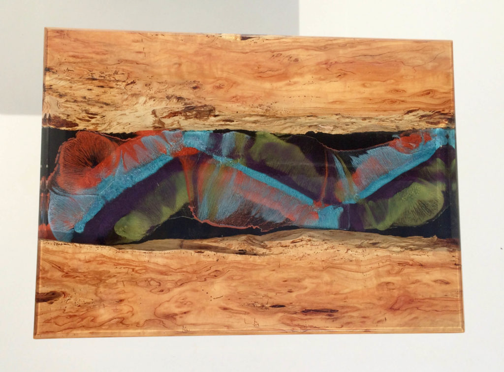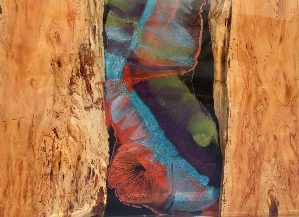 La couleur chaude et caramel du poirier associée aux couleurs vives des pigments coulés dans la résine composent un ensemble harmonieux.