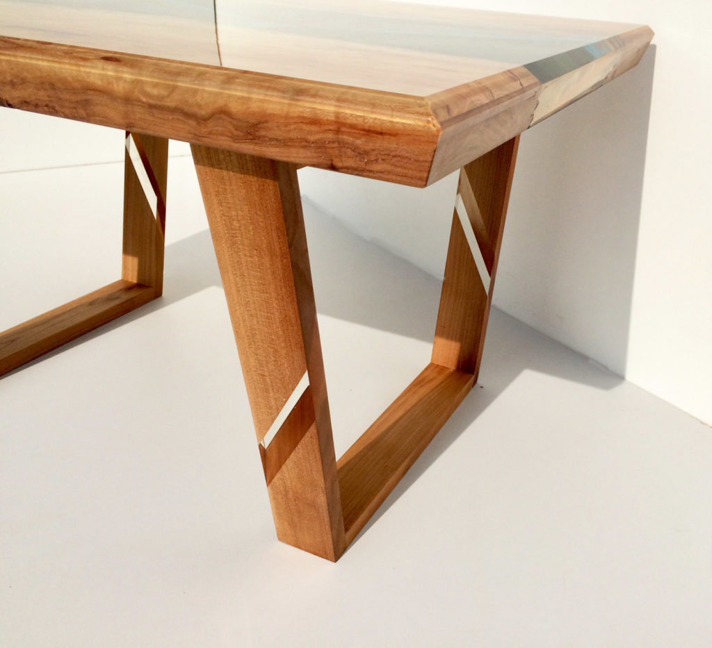 La forme du piétement en forme trapézoïdale achève de donner un look design à cette table basse en bois. Parlant de design, la découpe en biseau des pieds intégrant l’incrustation de résine transparente est résolument originale. Et il me semble, vu nulle par ailleurs…