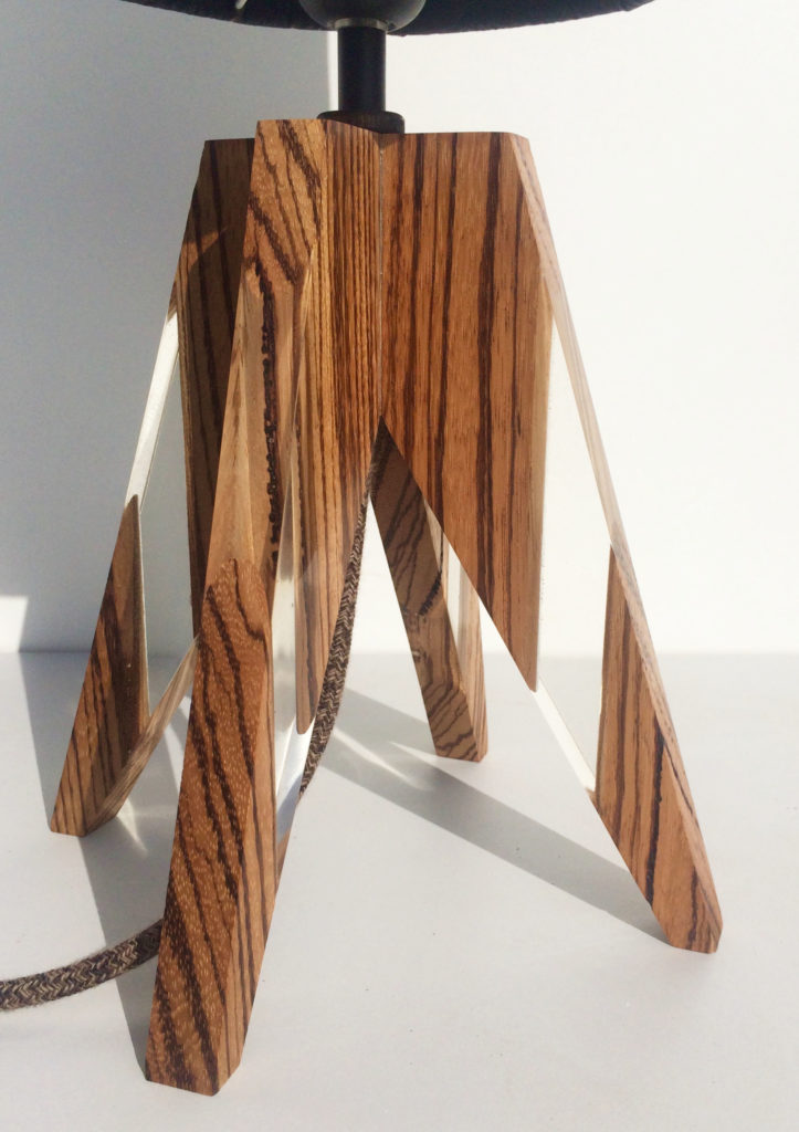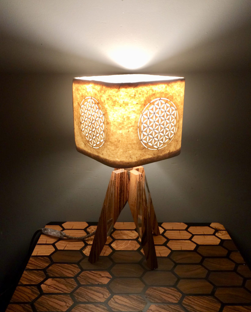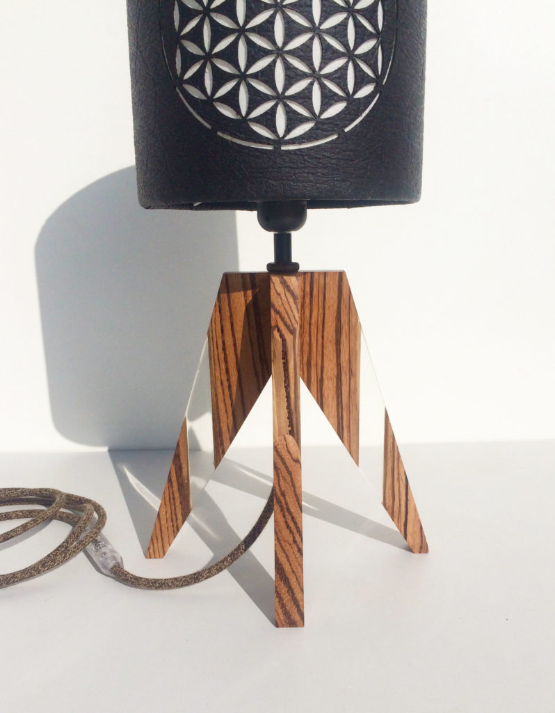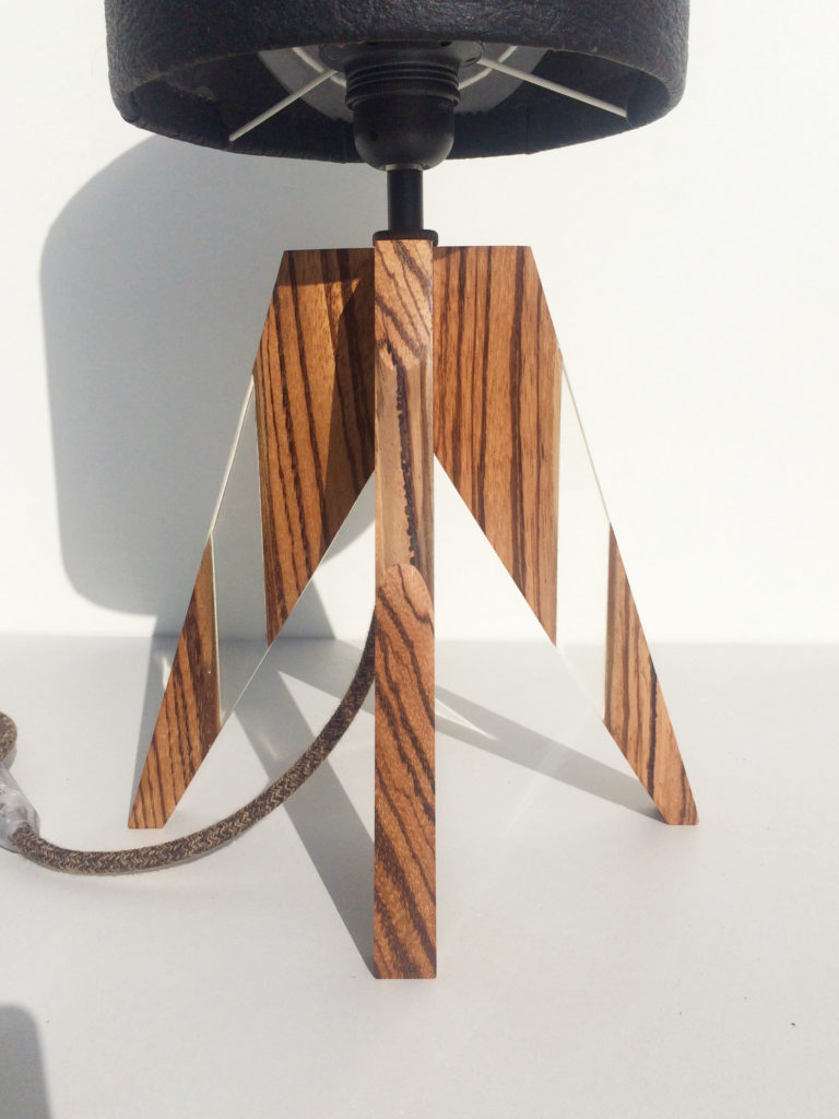 Enfin pour supporter cet abat jour particulier riche en symbole il lui fallait une essence de bois aussi rare que belle. J’ai choisi le Zébrano, une essence exceptionnelle d’Afrique de l’ouest. Ses zébrures d’ou elle tire son nom et sa couleur caramel claire sont elles aussi magiques.