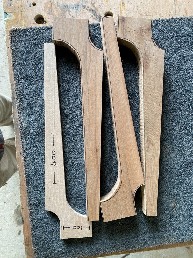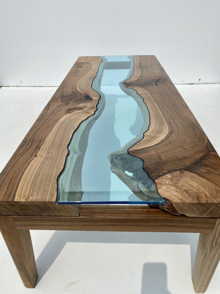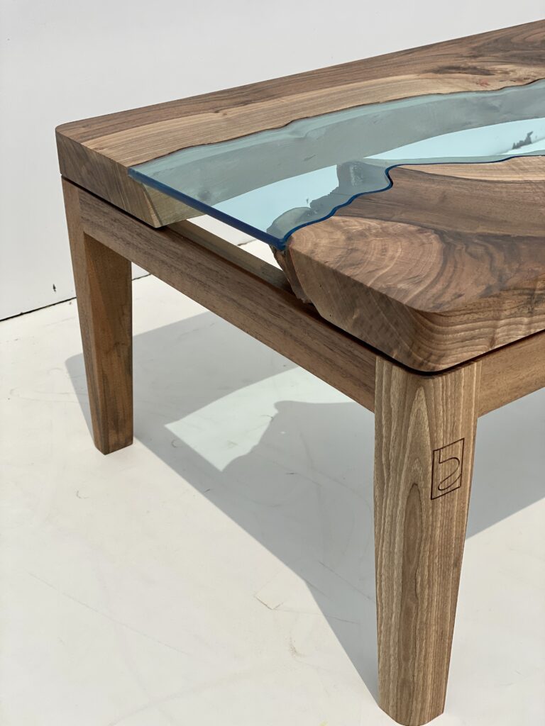 Table basse sur mesure pour un couple de Tours – Table basse en Noyer Français et plateau en verre bleuté découpé sur mesure.