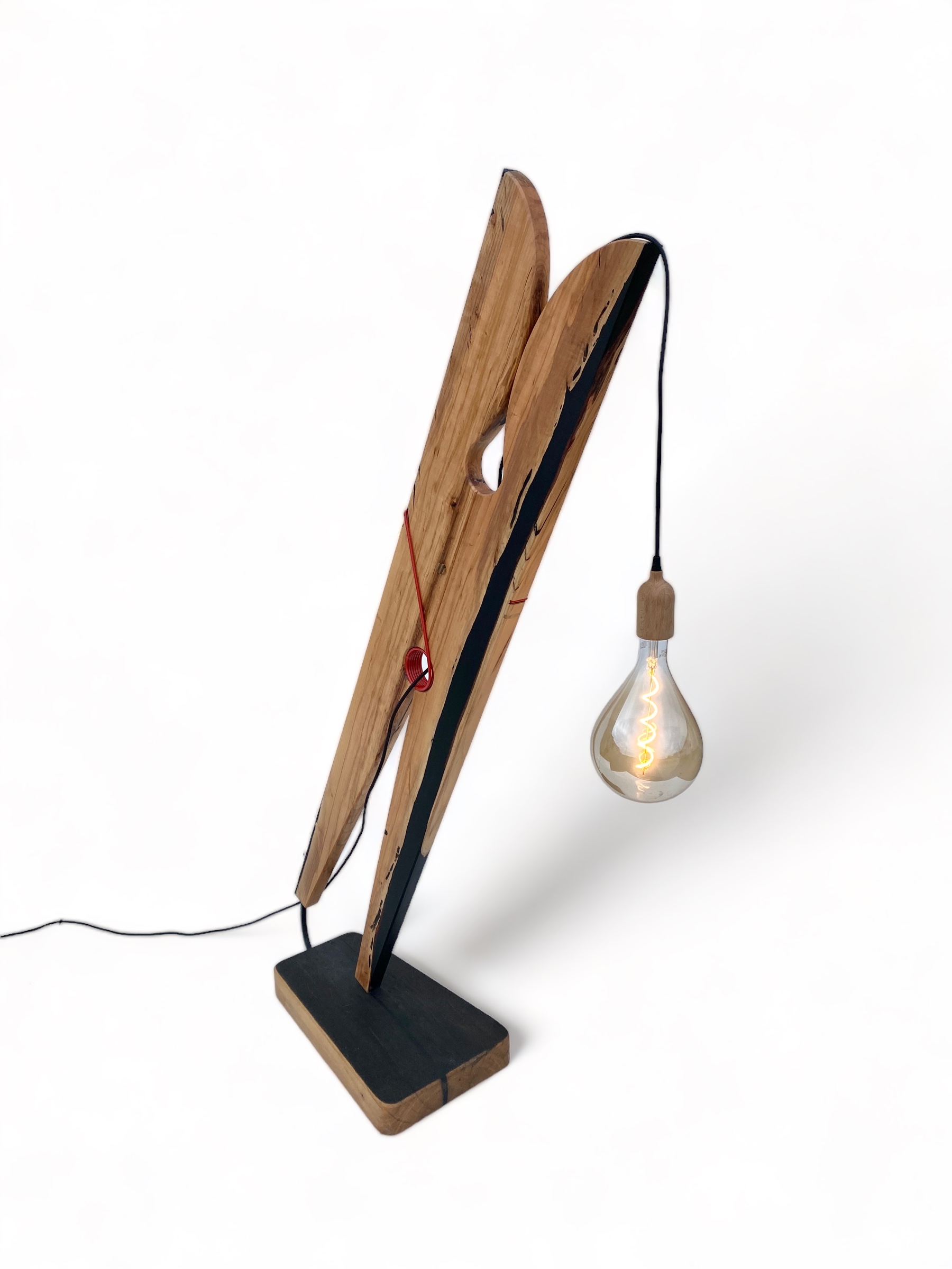 Pince-moi revisite la silhouette d’une simple pince pour en faire un lampadaire design à l’esprit pop et poétique. Réalisé en prunier massif, un bois de fruitier rare aux reflets chauds et cuivrés, il offre une présence chaleureuse et sculpturale.