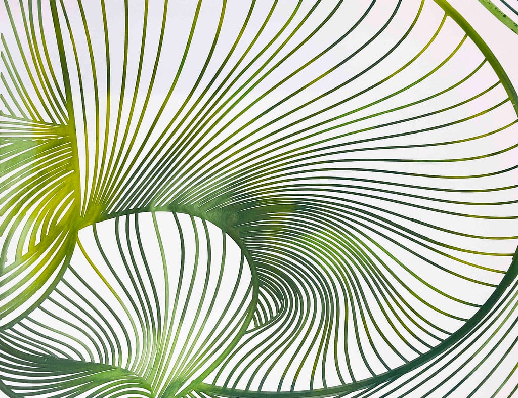 Cette fleur étrange est gravée dans le Corian. Ensuite j’ai coulé de la résine epoxy avec un camaïeu de vert afin de rendre l’ensemble aussi naturel que possible.